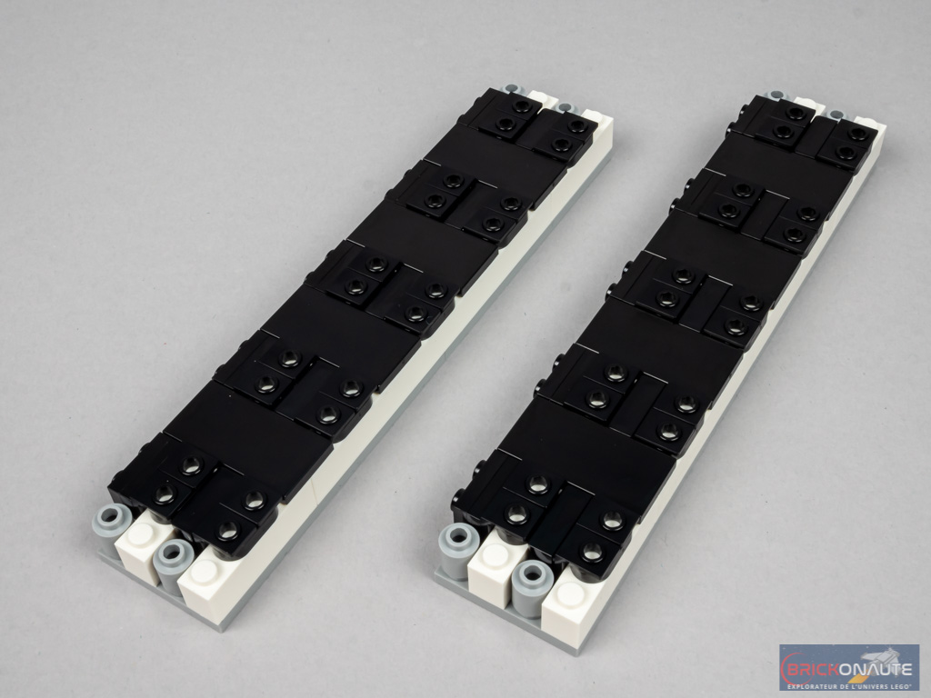 On commence l’étape suivante par la construction de 4 sous-ensembles, symétriques deux à deux. Le premier est fixé sur les briques SNOT de la structure, tandis que le second est clipsé juste devant. Nous assemblons alors 2 grands rectangles revêtant chacun 20 hublots, réalisés de la même manière qu’auparavant : des plates 1×2 rounded, surmontées de minifig backplate w/ knob, laissant apparaître une pièce blanche située en dessous. On fixe ces deux sous-ensembles sur les côtés du navire, juste en dessous du pont supérieur.