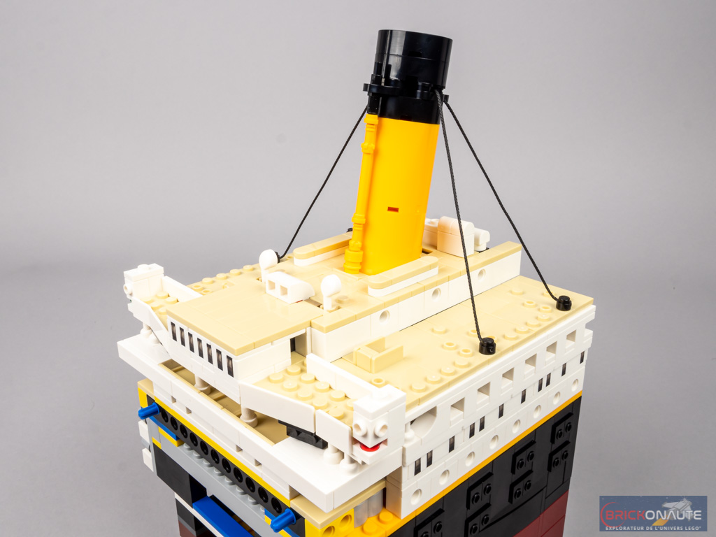 On commence par couvrir le pont des embarcations d’éléments de couleur tan. Puis on attaque un grand sous-ensemble avec la première cheminée. De couleur blanche et recouvert de tan, la cheminée y est fixée grâce à des pins Technic pour obtenir l’angle désiré. On ajoute également quelques éléments de décoration et notamment les divers instruments de navigation. Deux câbles, divisés en deux au niveau de la cheminée, sont fixés sur le pont et soutiennent cette dernière. On termine cette étape en attachant cette section à la précédente, formant ainsi le 1er tiers du navire. Attention à ce stade : la fixation n’est faite que sur 3 points – l’ensemble put s’avérer plutôt fragile.