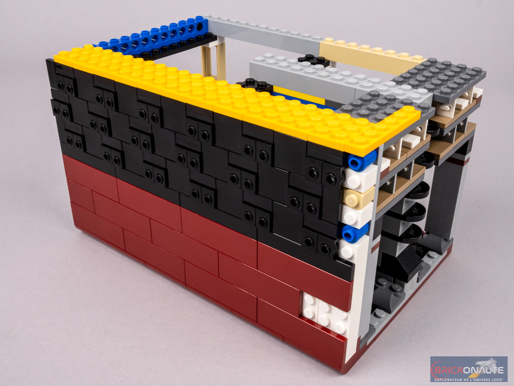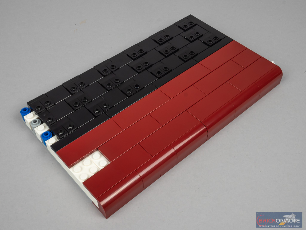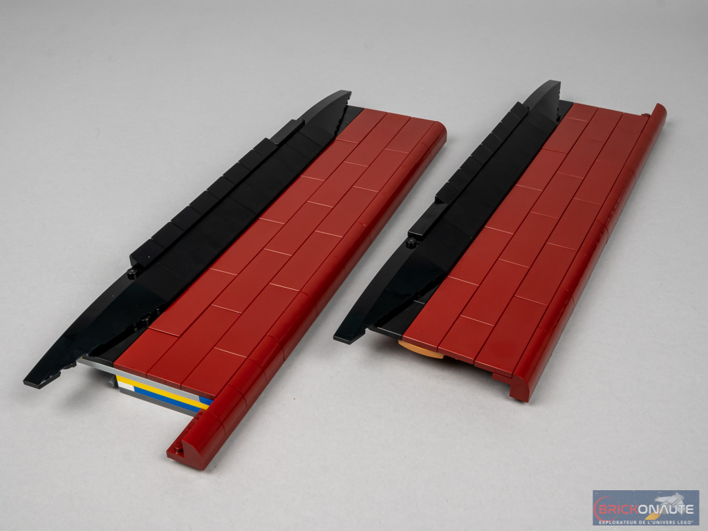 L’étape qui suit est assez rapide. On construit deux grands sous-ensembles, couverts côté extérieur de tiles et slopes noires et dark red. Remarquez ici les grandes tiles 2×6 en dark red. Côté intérieur, on fixe pour chacun de ces sous-ensembles 3 éléments pourvus de barres, qui permettent ensuite de clipser ces sous-ensembles à la structure. Et c’est toujours aussi appréciable de voir ce genre d’assemblage s’adapter parfaitement à l’emplacement qui leur est réservé !