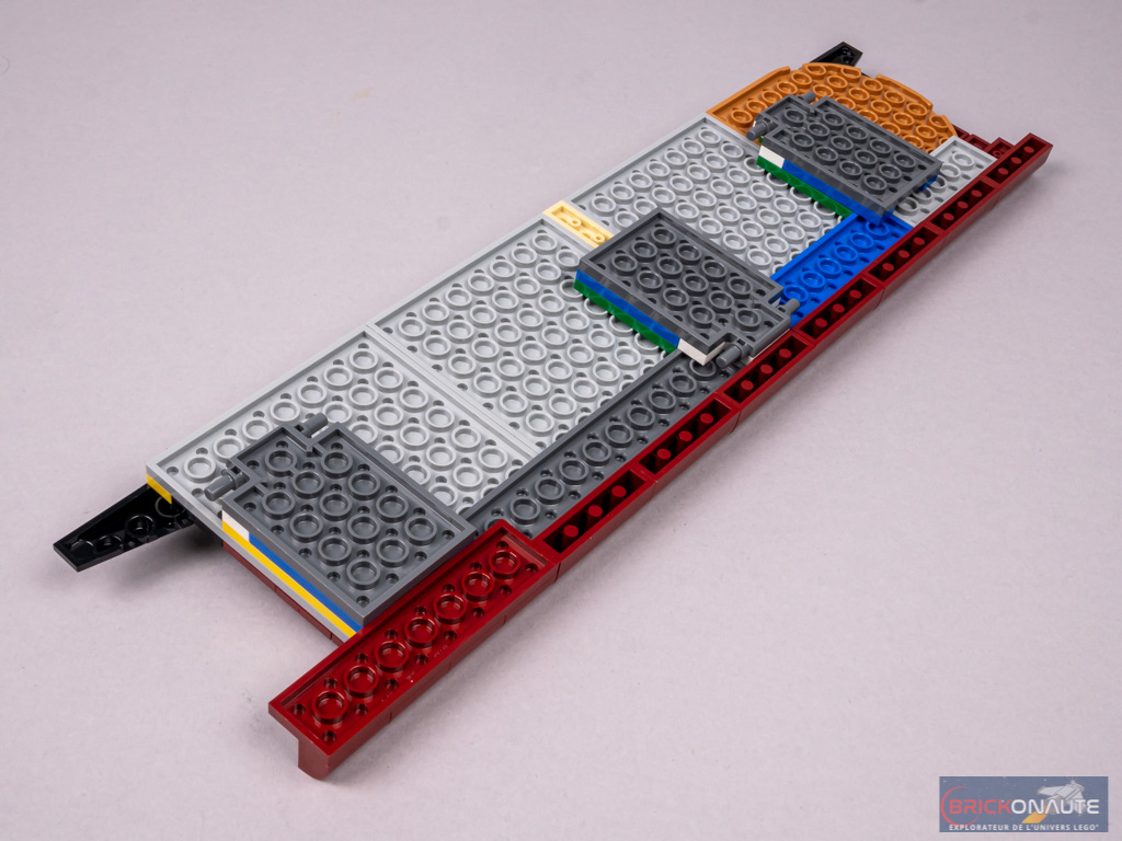 Nous construisons ici un grand sous-ensemble pour la coque. En partie inférieure, on retrouve les grandes tiles et slopes couleur dark red. En haut, on ne change pas de méthode pour réaliser les hublots : des plates 1×2 rounded, surmontées de minifig backplate w/ knob, laissant apparaître une pièce blanche située en dessous. On fixe ce sous-ensembles sur les briques SNOT de la structure, puis on ajoute le liseré flame yellowish orange en partie supérieure.
