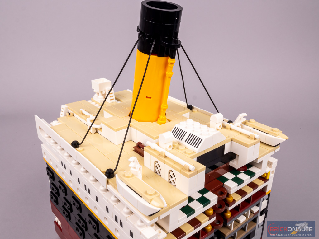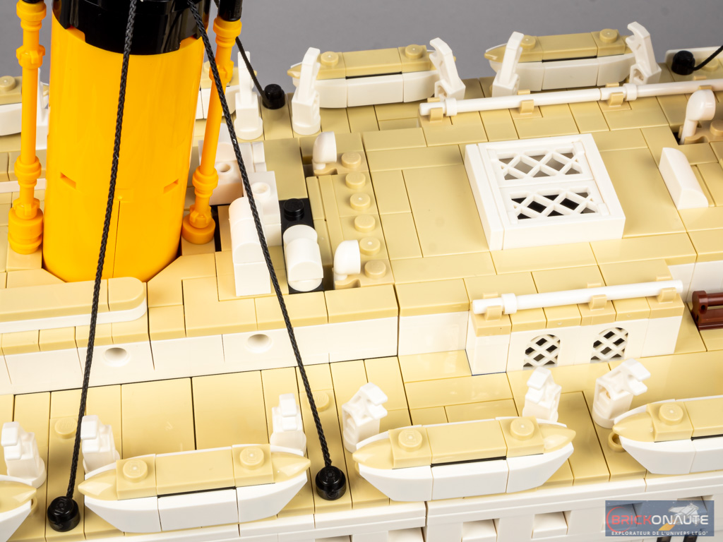 On commence cette étape par la deuxième cheminée. Elle est assemblée sur le même principe que la première : des pins Technic en partie basse permettent d’obtenir l’angle désiré. On enfiche ce sous-ensemble dans la structure, puis on fixe les câbles au pont. 2 petits sous-ensembles sont construits ensuite. Chacun d’entre eux comporte un banc microscale et vient se clipser sur la structure. On termine cette étape, et cette 3ème section, avec l’assemblage de 4 canots de sauvetage complémentaires.