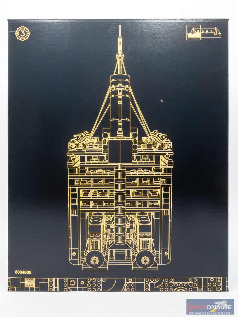 La troisième et dernière boîte se présente comme les deux précédentes : sur une des deux faces, on trouve une vue en coupe du bateau à sa jonction avec la section précédente. Sur l’autre, une vue de la poupe. La boîte contient 26 sachets numérotés de 29 à 46, ainsi qu’une grande tige blanche. La troisième notice d’instructions est présentée dans une pochette cartonnée, et compte 320 pages pour 450 étapes de construction.