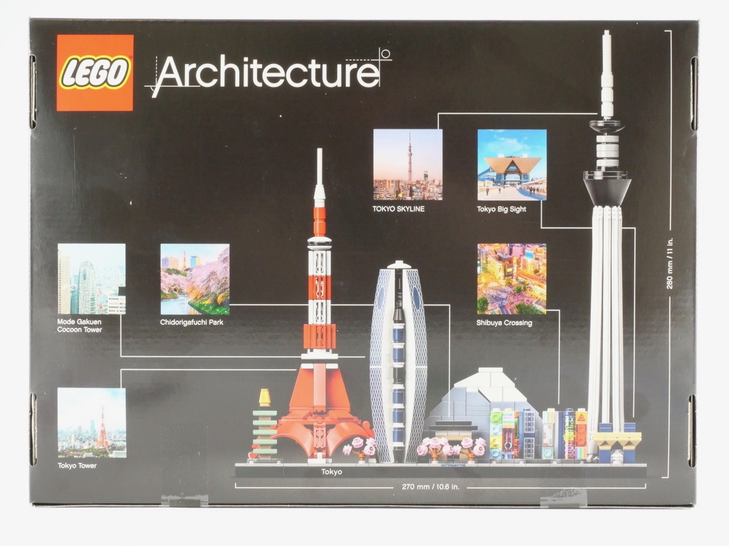 Dans cette gamme résolument premium qu’est la gamme LEGO Architecture, LEGO fait un effort particulier dans le packaging pour faire de ces sets des boîtes clairement destinées aux adultes, à des fins d’exposition. Dans sa traditionnelle livrée noire, la face avant de la boîte nous propose une vue du set sans fioritures. Au dos, une vue légèrement différente nous présente les différents bâtiments présents : la Tokyo Tower, la Mode Gakuen Tower, le parc Chidorigafuchi, le carrefour de Shibuya, le Tokyo Skytree (mal identifié sur la boîte, sous le nom de Tokyo Skyline) et le Tokyo Big Sight. Une petite pagode et la silhouette du mont Fuji complètent le tout.