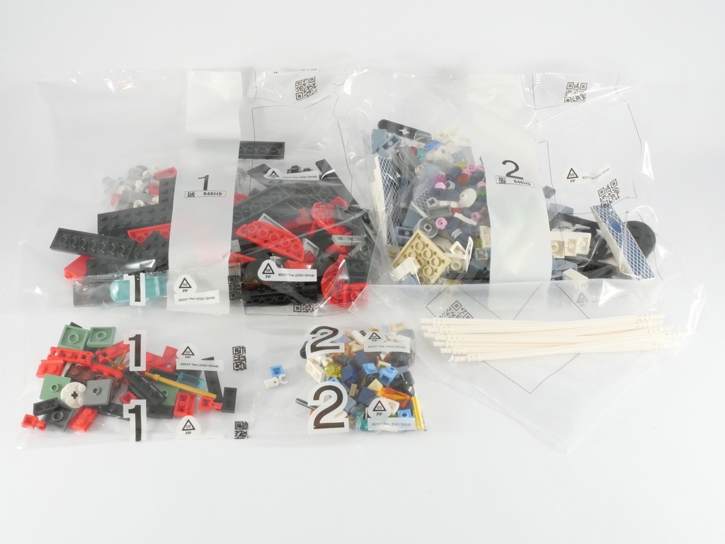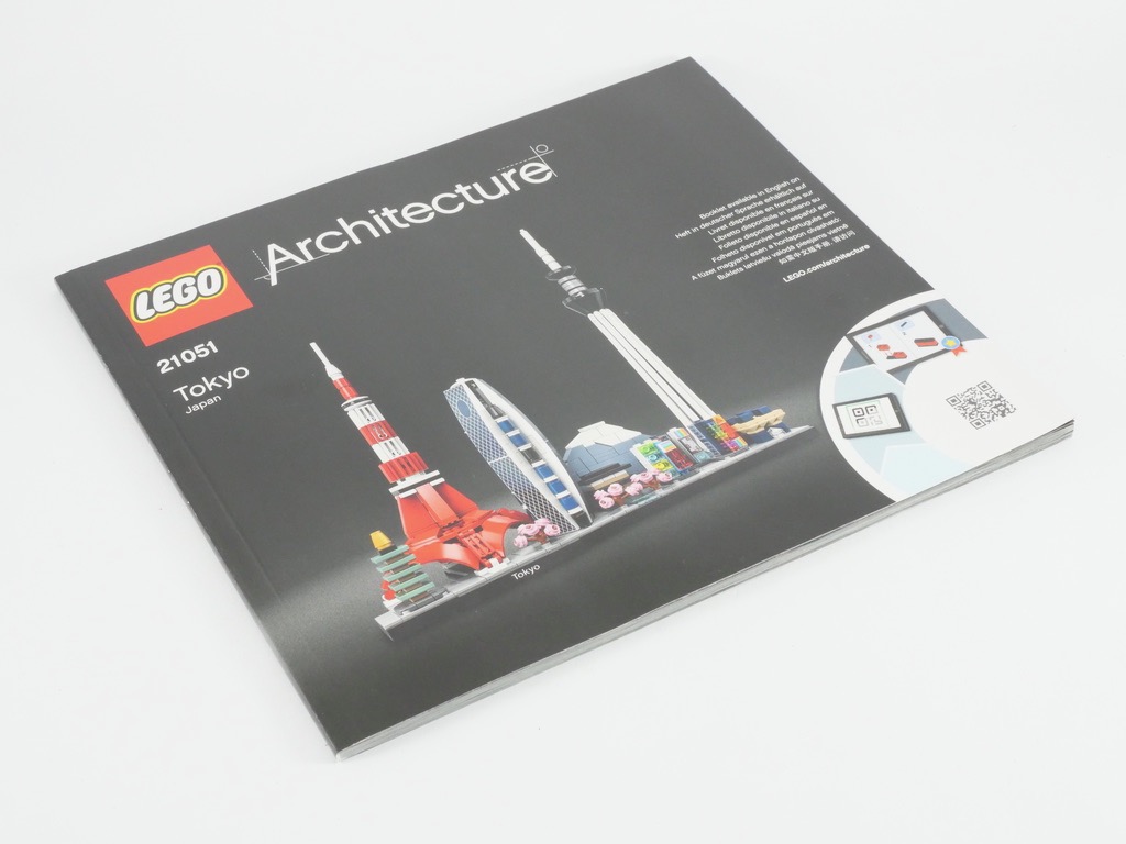A l’intérieur, deux sachets portent le numéro 1 et deux autres le numéro 2. Un cinquième sachet n’est pas numéroté et contient les pièces flexibles blanches nécessaires à la réalisation du Tokyo Skytree. On trouve également une notice d’instructions de 96 pages pour 91 étapes de construction. Celle-ci commence, comme d’habitude, par la présentation des différents éléments de la skyline. Elle est également ponctuée d’informations les concernant au fil de la construction. On trouve également la présentation des différents bâtiments dans une notice en français téléchargeable sur le site de LEGO.