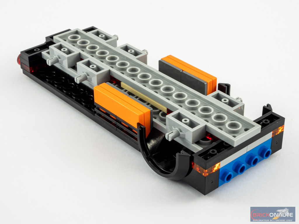 On attaque ensuite la troisième notice d’instructions, et le « gros » véhicule du set : le camion de recyclage. Le châssis n’est pas préfabriqué et se construit sur une plate de 2×16 tenons qu’on élargit pour obtenir un véhicule de 6 tenons de large. Les feux sont brick-built et quelques brackets ornés de tiles oranges représentent les réservoirs.