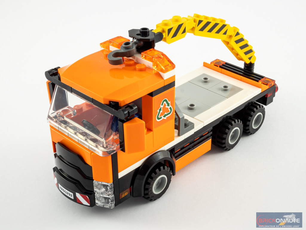 Le design de l’ensemble reste simple : rappelons qu’il s’agit d’un set LEGO CITY destiné aux plus jeunes. Mais c’est très propre, et il devrait être possible d’intégrer cet ensemble dans une ville de plus grande ampleur. Au delà des bâtiments, on appréciera plusieurs choses à commencer par le camion de recyclage : avec sa couleur orange et son grand plateau à l’arrière, ce type de véhicule est assez inhabituel et bien réalisé. Les autres véhicules sont plus quelconques, et je crois que la voiturette électrique aurait mérité un peu plus d’égards.