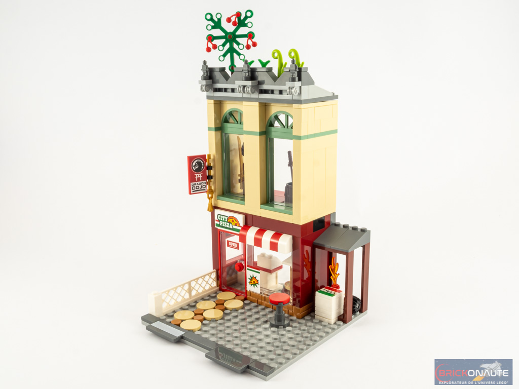 On attaque alors la cinquième et dernière notice, qui concerne le bâtiment principal. Celui-ci se base également sur une plate de 16×16 tenons. On aménage le rez-de-chaussée avec une pizzeria, son four avec quelques flammes, sa caisse enregistreuse, sa vitrine et son store rouge et blanc. Une fenêtre battante sur le côté permet le drive. Quelques tenons permettront de détacher les différents niveaux à la manière d’un bâtiment modulaire.