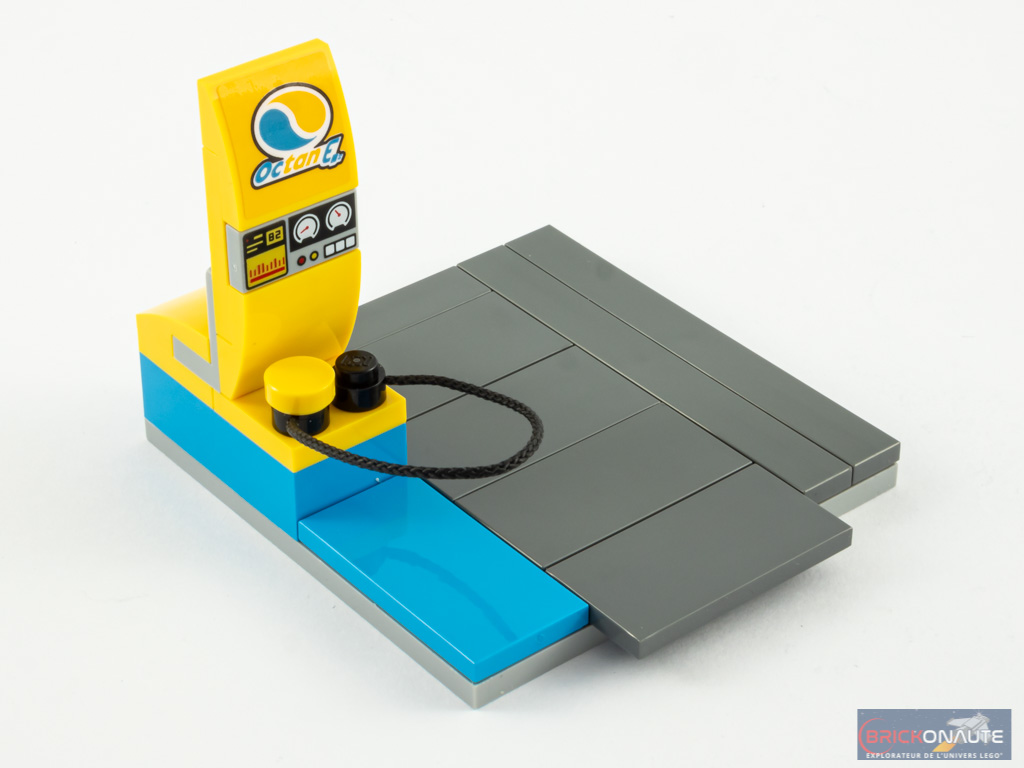 La construction commence par l’assemblage de 3 véhicules : la moto (avec ses deux autocollants en « Z », pas forcément faciles à appliquer), le VTT et la petite voiture. Cette dernière est basée sur un châssis préfabriqué de 4×7 tenons et ressemble d’ailleurs plutôt à une voiturette sans permis. Il s’agit ici d’une petite voiture électrique, que l’on peut brancher à la station de recharge grâce au jumper présent juste au-dessus du pare-chocs. On construit d’ailleurs cette station de recharge juste après : il s’agit juste de quelques tiles et d’une station jaune et bleue aux couleurs d’OctanE.