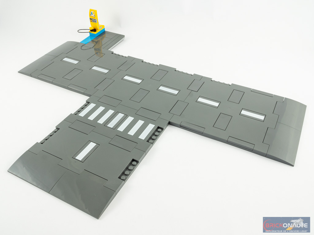 Je vais commencer ce verdict avec le principal intérêt de ce set : c’est celui qui contient le plus d’éléments du nouveau système de route modulaire ET des aménagements urbains (le set 60304 Road Plates contient plus d’éléments, mais aucun bâtiment). Avec 3 modules de 16×16 tenons, et deux demi-modules dont un tampographié d’un passage piétons, les possibilités de personnalisation de la ville sont intéressantes. Vous remarquerez aussi que tous les autres éléments composant notre ville s’inscrivent dans cette « grille » : la station de lavage et le bâtiment sont basés sur des plates de 16×16 tenons ; la station de recyclage et le petit parc sur un demi-module. Tout est donc ultra-modulable, c’est d’ailleurs le véritable intérêt de ce nouveau système. J’ai choisi dans mes photos de vous présenter la configuration « suggérée » dans la notice, mais chacun fera bien ce qu’il veut.
