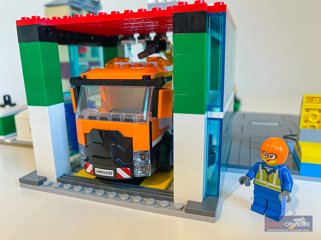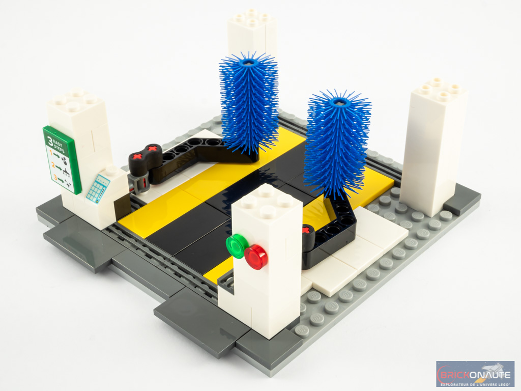 Nous continuons avec la station de lavage, basée sur une plate grise de 16×16 tenons. Sa dimension est donc identique aux modules de route « standard » – et c’est plutôt bien pensé pour l’organisation des modules et aménagements / bâtiments qui les accompagnent. On dispose quelques tiles à l’intérieur et 4 poteaux blancs dont deux sont décorés. Les brosses sont fixées grâce à des pièces souples et s’écartent donc seules au passage d’un véhicule.