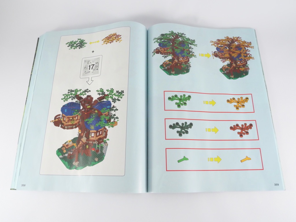A l’intérieur, nous trouvons 21 sachets numérotés (de 1 à 19) et 10 autres sachets contenant les feuilles pour les deux versions de l’arbre. Nous trouvons également une notice d’instructions de 428 pages. La bonne nouvelle : pas de stickers à l’horizon, tous les éléments décorés sont tampographiés. Comme d’habitude dans la gamme LEGO Ideas, la notice commence par une présentation du fan designer (ici le français Kevin Feeser) et du designer LEGO ayant retravaillé le set (César Soares).
