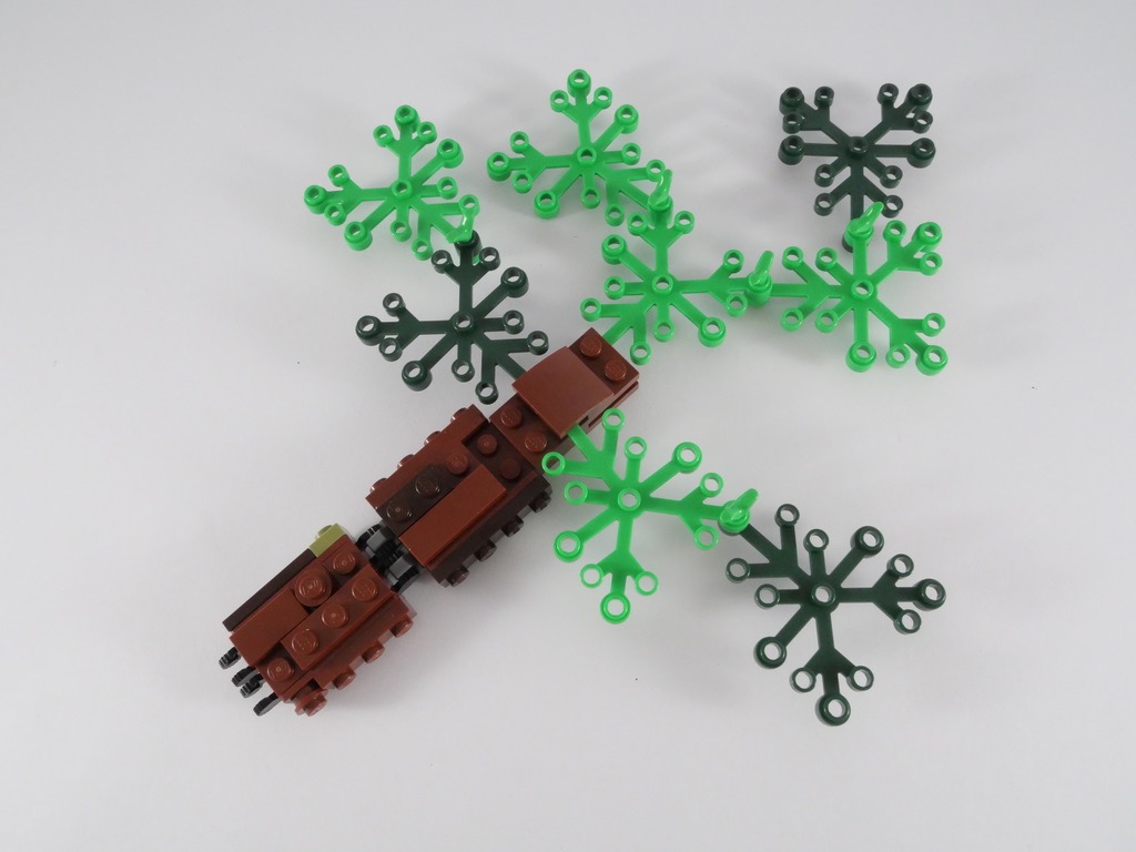 Rebelote avec le dernier sachet de pièces, qui commence par la construction de 4 autres branches quasi-identiques. Elles sont en revanche plus petites que celles construites à l’étape précédente. La construction se termine avec l’ajout de quelques branches sous les cabanes, fixées sur des barres qu’on enfiche dans les trous laissés lors de la construction desdites cabanes. Quelques unes sont agrémentées d’une lanterne.