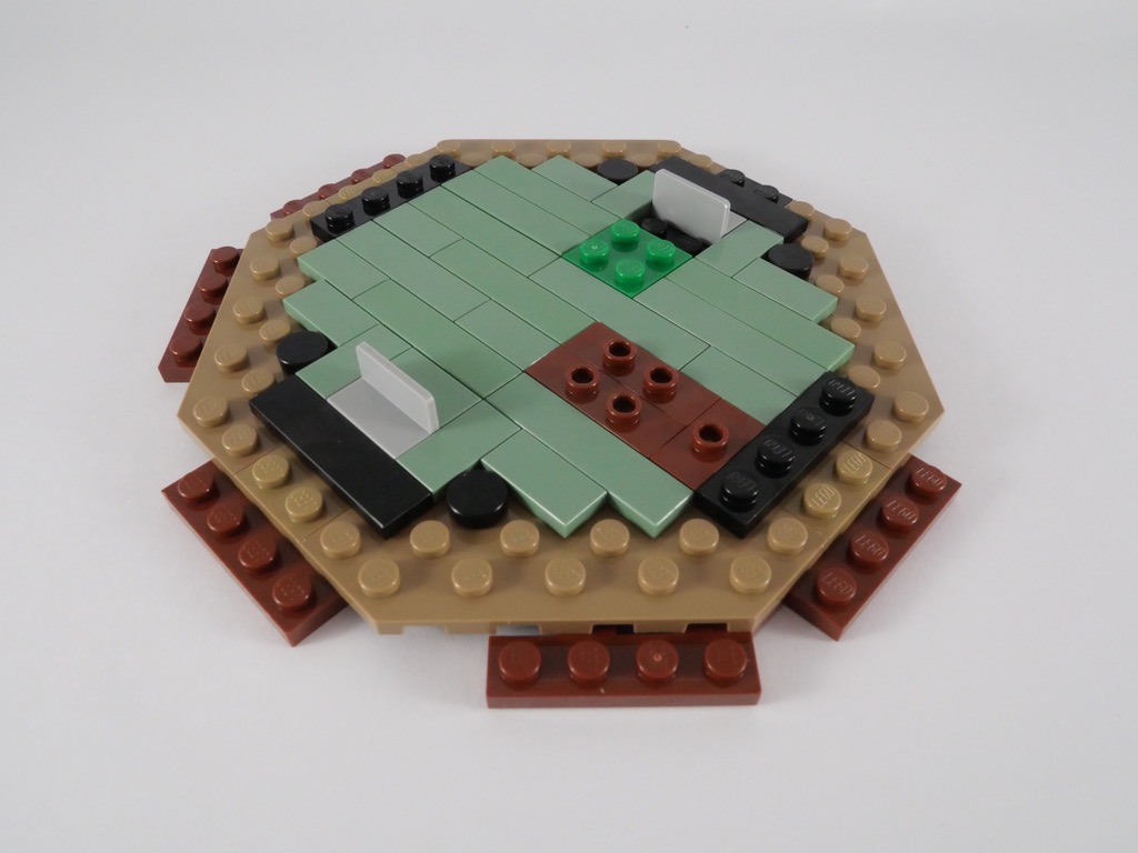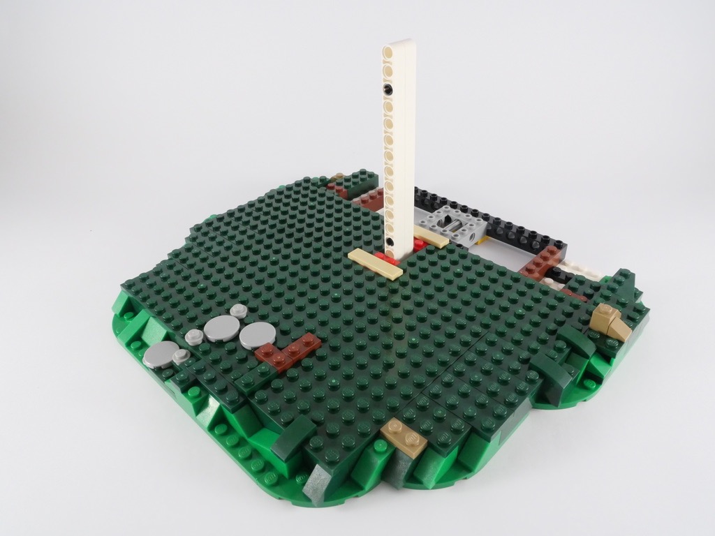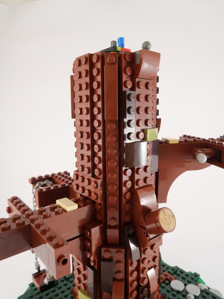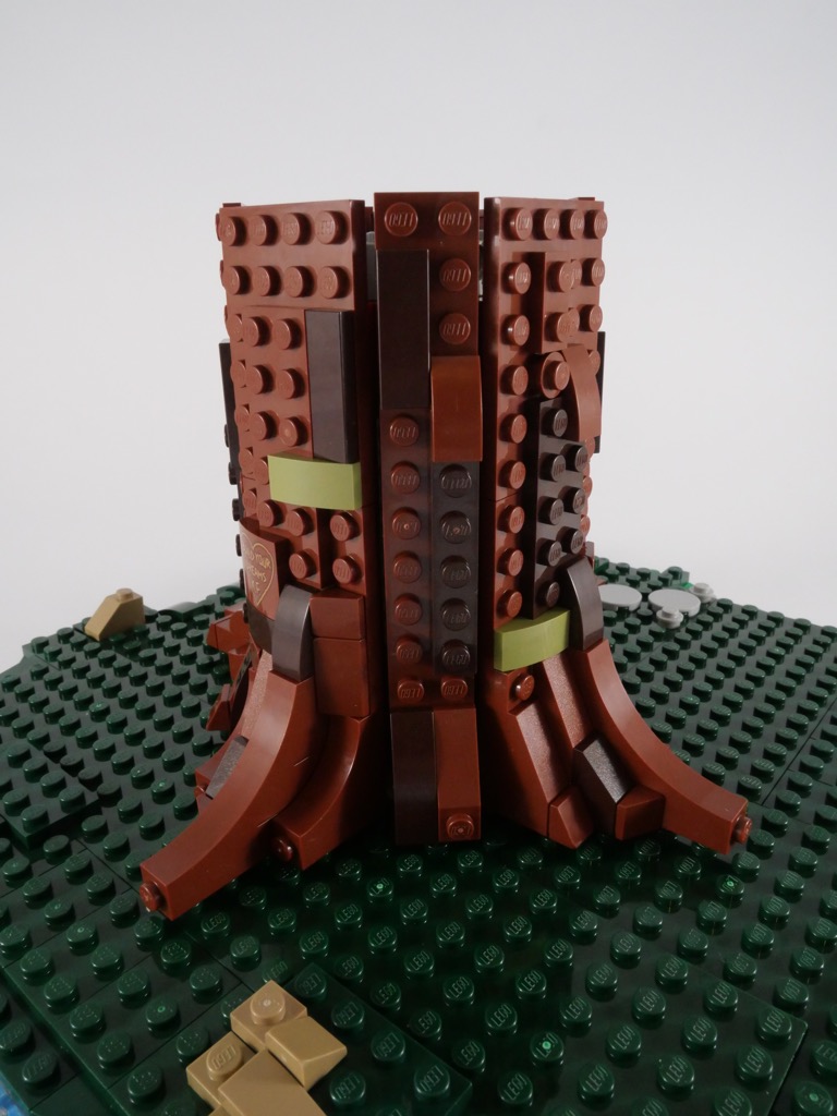 La construction commence logiquement par la base de l’arbre. Après avoir assemblé une structure composée de cadres et briques Technic. La structure interne du tronc (deux beams blancs) est solidement fixée au cadre intérieur. On agrandit ensuite la structure sur ses différents côtés avec l’ajout de plates vertes. Celles-ci sont décorées, sur l’extérieur, par des pièces de couleurs variées (vertes, marrons, grises ou encore dark tan) pour représenter la végétation et les rochers présents autour de l’arbre. Le designer a même pris le soin de planquer, sous une des plates, un joyau que seul le constructeur du set saura dénicher. On recouvre le tout de plates couleur dark green.
