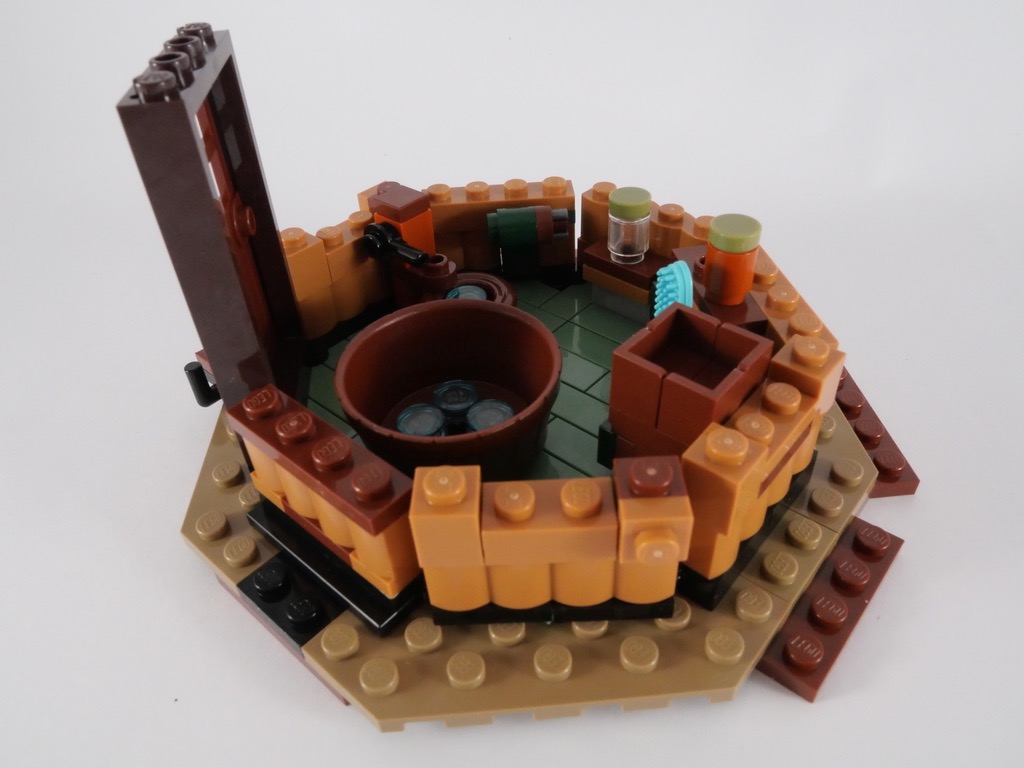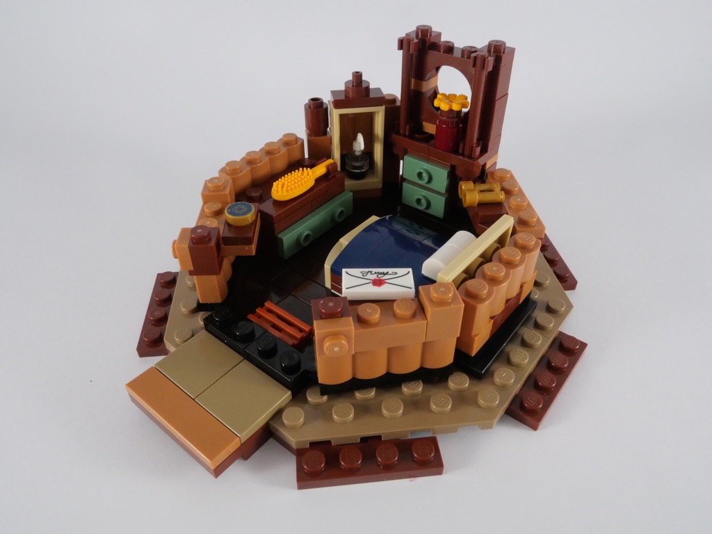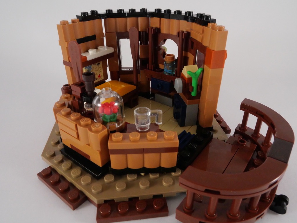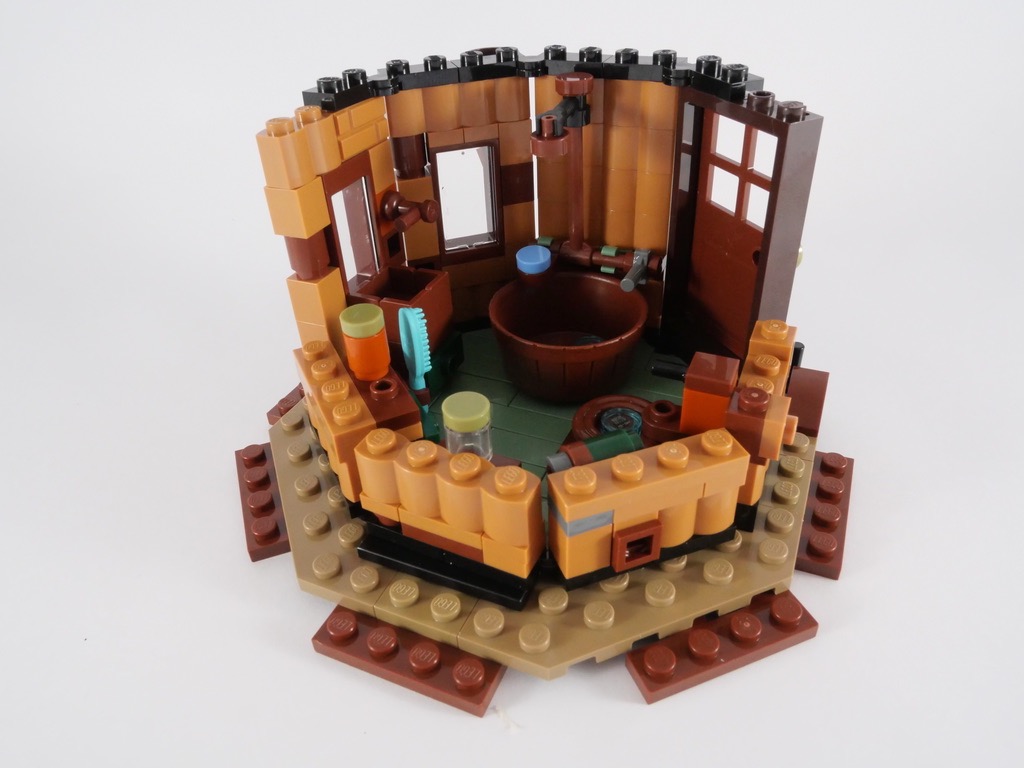 Il est temps d’aménager les lieux d’habitation. On commence cette première cabane par sa base, octogonale. Le lit est ajouté, au-dessous duquel se cache un petit détail sympathique : une paire de ciseaux est cachée. Une référence à Kevin Feeser, le fan (français) designer du projet LEGO Ideas, qui est coiffeur dans la vraie vie. On passe alors au murs. Les différents pans de murs sont reliés entre eux par des charnières, qui permettent d’obtenir la forme octogonale de la pièce. On ajoute plein de petits éléments : un encrier, des jumelles, une boussole, une commode avec une brosse à cheveux ou même un pot de fleurs. Et on apprend de nouvelles techniques intéressantes, notamment ici dans la manière de réaliser la fenêtre ronde, à l’aide d’arches inversées.