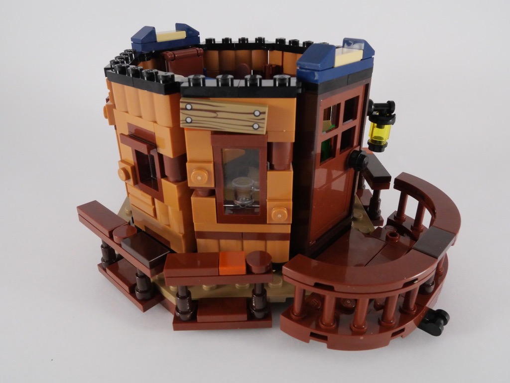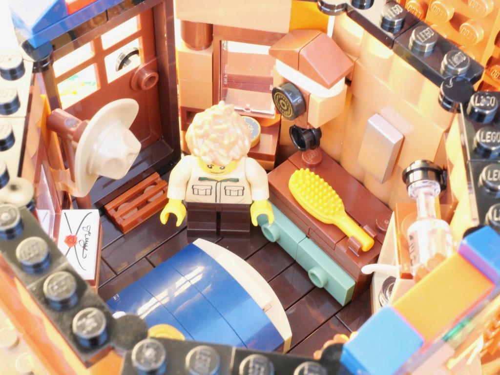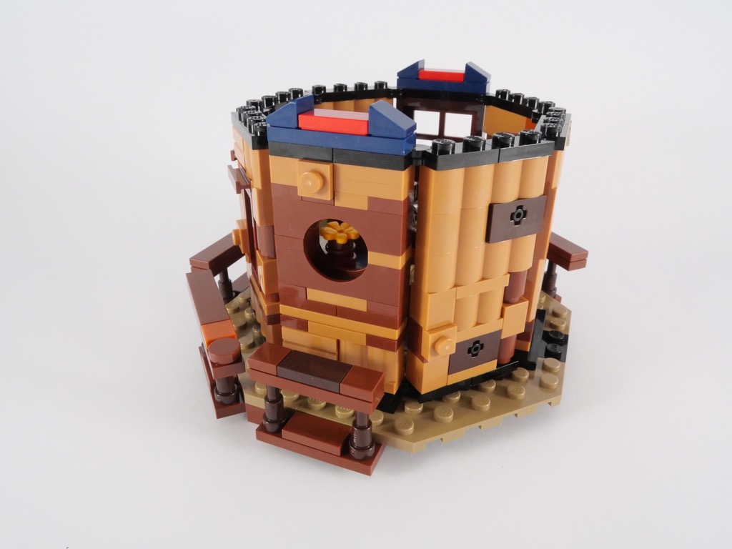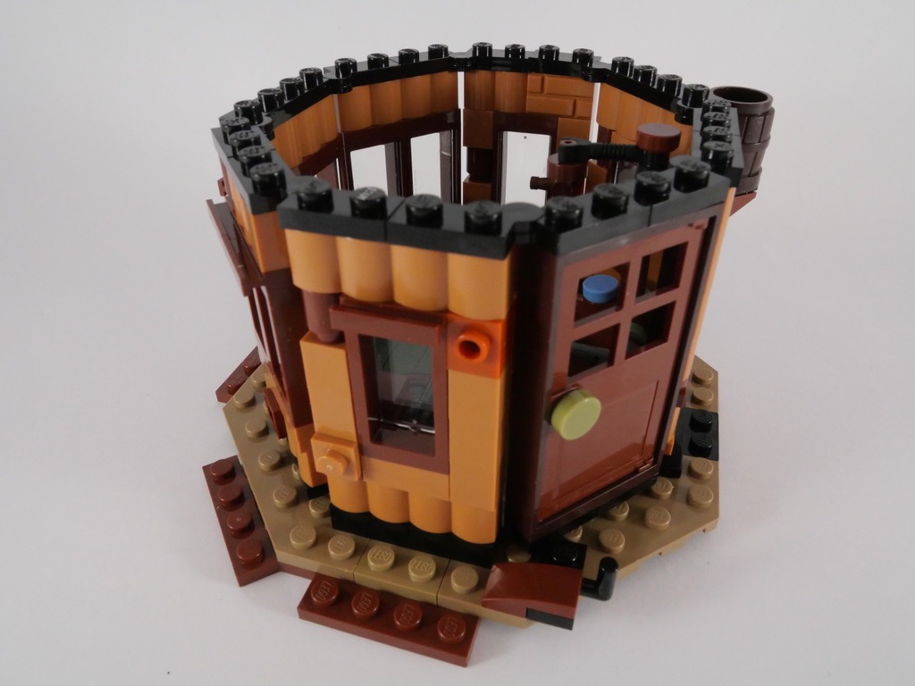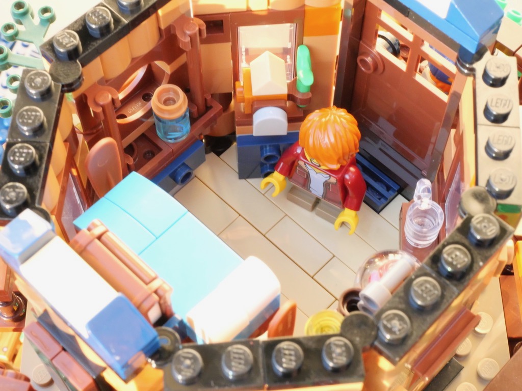Il est temps d’aménager les lieux d’habitation. On commence cette première cabane par sa base, octogonale. Le lit est ajouté, au-dessous duquel se cache un petit détail sympathique : une paire de ciseaux est cachée. Une référence à Kevin Feeser, le fan (français) designer du projet LEGO Ideas, qui est coiffeur dans la vraie vie. On passe alors au murs. Les différents pans de murs sont reliés entre eux par des charnières, qui permettent d’obtenir la forme octogonale de la pièce. On ajoute plein de petits éléments : un encrier, des jumelles, une boussole, une commode avec une brosse à cheveux ou même un pot de fleurs. Et on apprend de nouvelles techniques intéressantes, notamment ici dans la manière de réaliser la fenêtre ronde, à l’aide d’arches inversées.