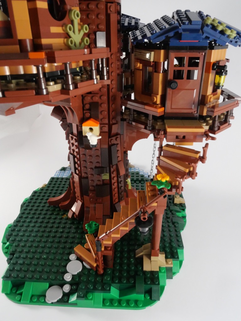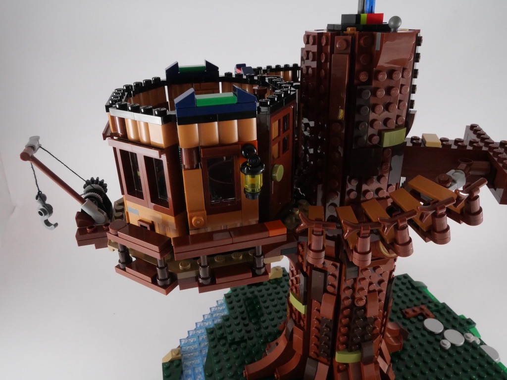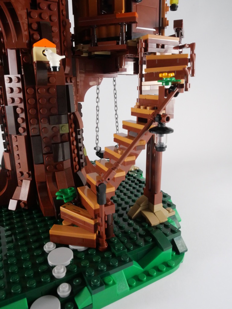 On continue cette première cabane en ajoutant les fenêtres, puis en continuant d’élever les murs. D’autres détails sont ajoutés au fur et à mesure : un coucou, un bateau dans une bouteille (référence au set 21313 – Ship in a Bottle) ou encore un miroir. Sans oublier les détails situé côté extérieur, avec les briques texturées ou les tenons dépassant par endroit. On referme la partie supérieure avec des charnières, puis on termine cette première cabane avec les rambardes qui l’entourent. Ne manquera plus que le toit. On fixe alors cette première cabane à la branche la plus basse de l’arbre.