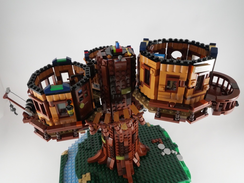 Les cabanes en elles-mêmes sont magnifiques, qu’il s’agisse de l’extérieur ou de l’intérieur. Ainsi, on retrouve sur l’extérieur des briques texturées ou des tenons apparents, ou encore une disposition et une forme des fenêtres différentes suivant les cabanes. L’une des cabanes dispose même d’un balcon. L’intérieur des différents cabanes est très riche et superbement réalisé : que ce soit les meubles ou les accessoires, rien ne manque. Peut-être est-ce même un peu trop chargé : il sera parfois difficile de placer les minifigs à l’intérieur. Côté extérieur, j’aurais aimé que le cheminement soit un peu plus large : les rambardes sont si proches des cabanes qu’on ne peut pas y faire circuler les minifigs. On notera tout de même que l’on peut facilement observer l’intérieur des cabanes : la partie supérieure de l’arbre et les toits de ceux-ci sont prévus pour se détacher facilement.