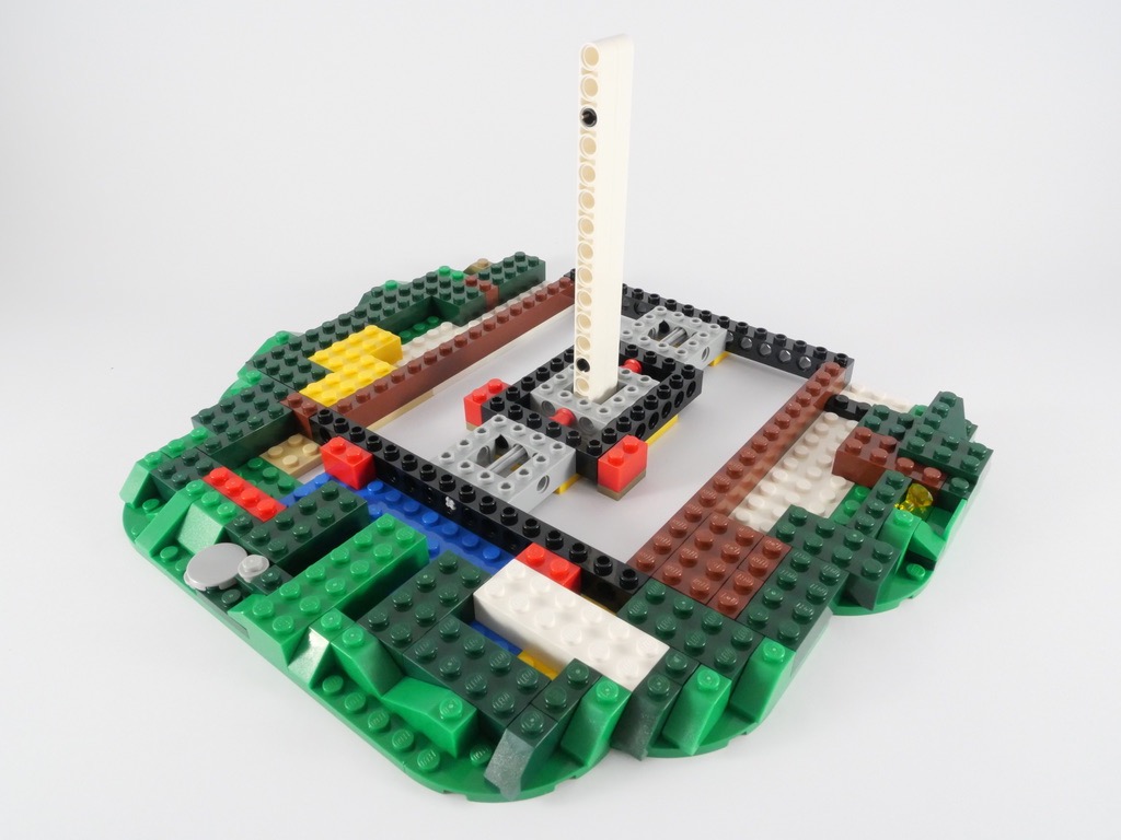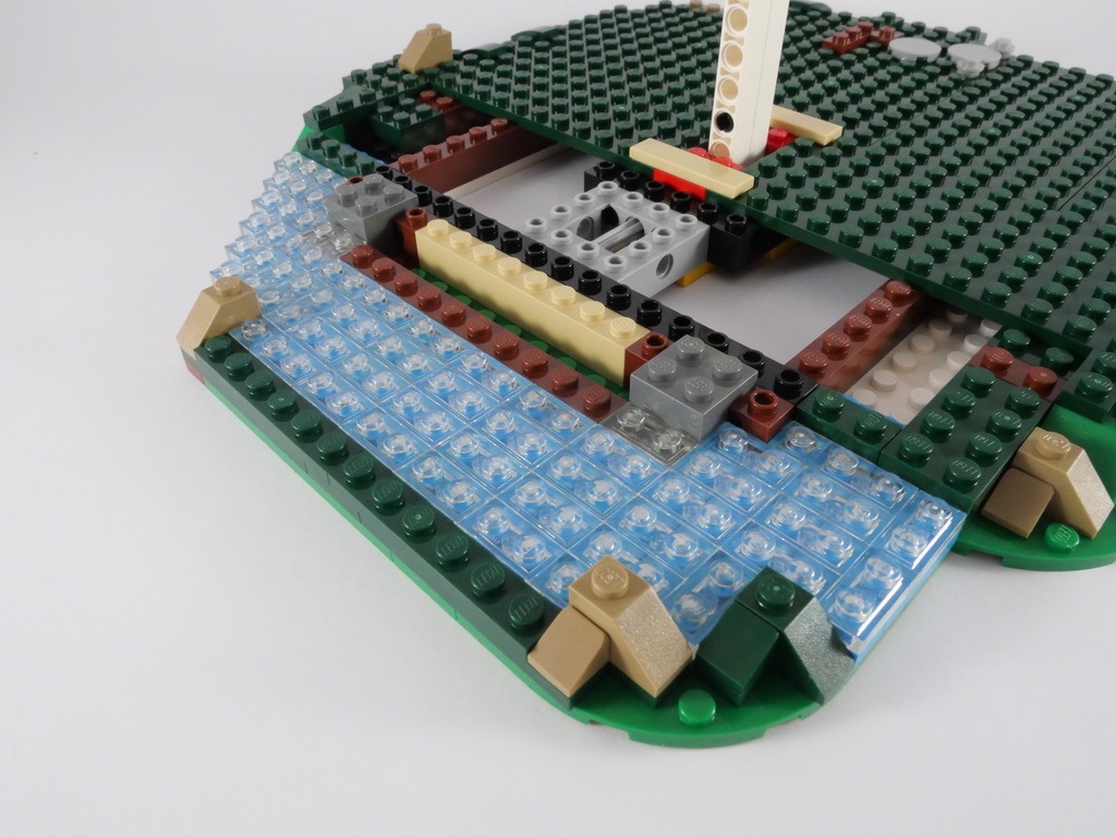 On ajoute ensuite, de l’autre côté, un morceau de rivière. Celui-ci est composé de plates bleues, couvertes d’autres plates transparentes pour apporter un peu de brillance. Il s’agit d’une technique qu’on a pu voir récemment dans d’autres sets, qui reste néanmoins intéressante. On construit alors la berge et quelques rochers, avant de terminer la base en refermant les espaces libres à l’aide de plates vert foncé.
