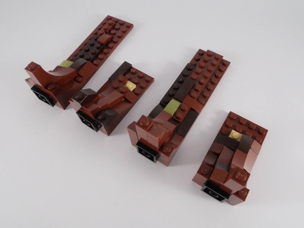 On construit alors les 4 grandes « faces » du tronc. Sur des plates couleur reddish brown, on ajoute des pièces de différentes tailles, formes et couleurs, apportant un côté organique bienvenu pour un arbre. On fixe ces 4 grandes faces sur les briques de la structure, et on vient ensuite attacher l’ensemble aux deux beams blancs laissés au milieu de la base. Une barre Technic, insérée en partie supérieure, sécurise le tout. On passe alors aux 4 « petites » faces, intéressantes dans la manière de les fixer au tronc : les pièces Technic situées sur leur face inférieure viennent s’insérer dans les tiges des Plate 1X1 Round W/ Horizontal 3.2 Shaft laissées en attente dans les angles de la structure. L’une des slopes est tampographiée d’un coeur renfermant la mention « Build your dreams », l’écriture étant celle de Kevin Feeser, le fan designer du set.