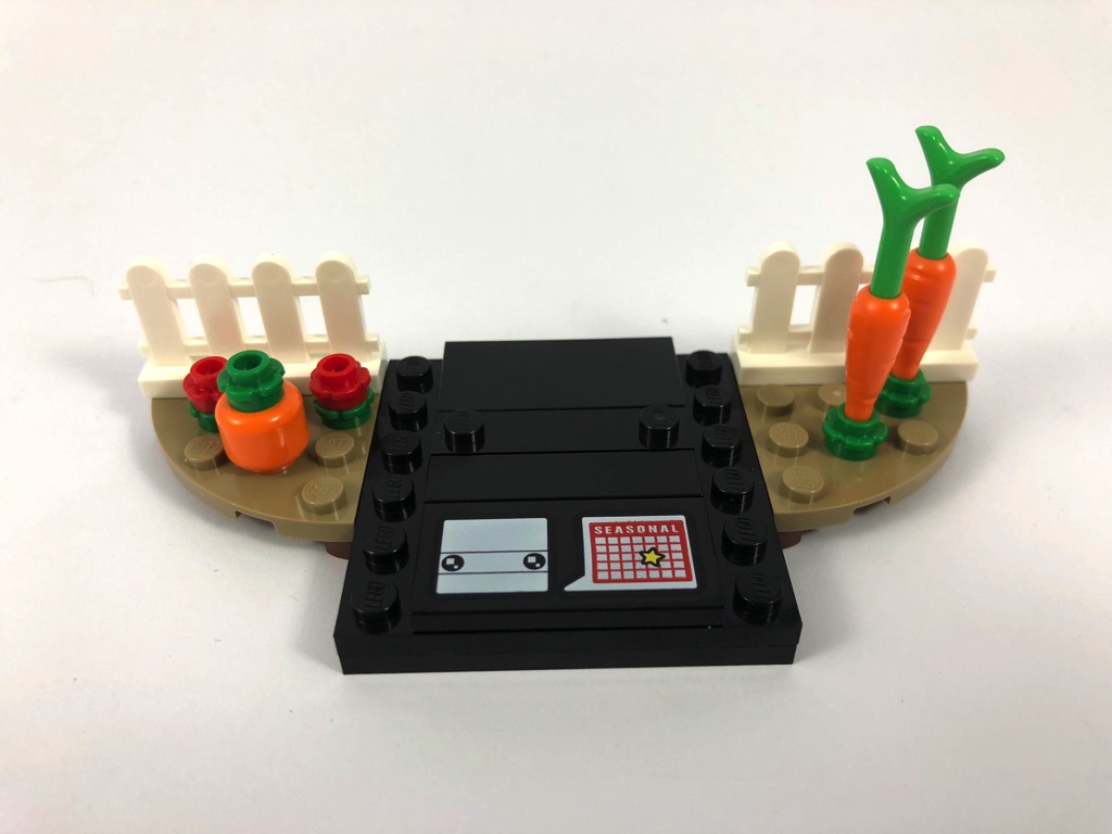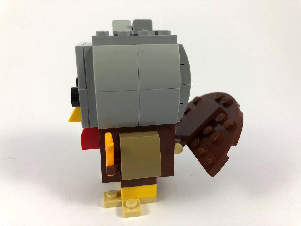 Bon, je ne vais pas m’étendre sur la construction, c’est très basique. On notera simplement au dos la présence d’une « poignée » permettant de clipser la queue, composée de manière simplissime par 3 pièces. Le fanon (repli de peau rouge sous le menton) est simplement composé de deux briques incurvées décalées de l’épaisseur d’une plate. L’intérieur de la tête est tout à fait standard (12 briques SNOT et « cerveau » rose), et l’habillage de celle-ci l’est tout autant : la seule fantaisie est le bec jaune, une slope disposée au niveau de la « bouche ». Les 3 autres faces sont identiques, et la partie supérieure laisse les tenons de la plate visible hormis pour deux « plumes » (des cheese slopes). On termine la construction avec le support d’exposition caractéristique de ces BrickHeadz saisonnières, avec deux bouts de jardin, une clôture et quelques légumes.