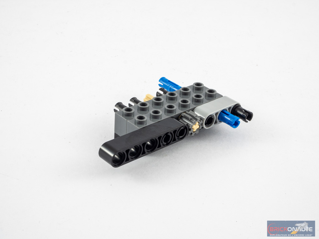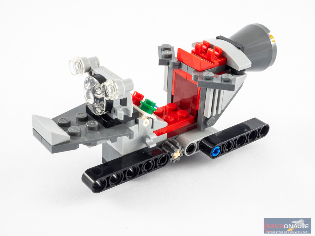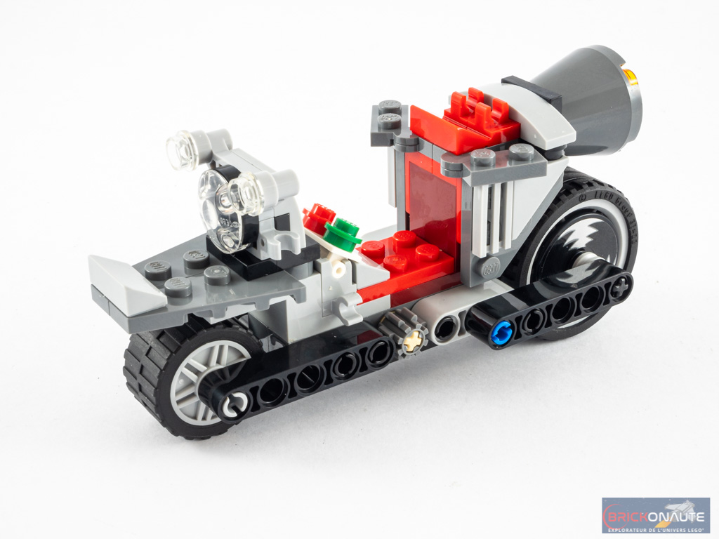 Nous nous occupons ensuite de la moto, répartie dans les deux sachets suivants. Sa structure centrale est composée de quelques pièces Technic sur lesquelles on apporte deux grandes pièces en forme de « S » pour former le poste de pilotage. On habille alors cet ensemble grâce à différentes briques SNOT avant d’y ajouter le réacteur à l’arrière, et le guidon à l’avant. La construction s’achève avec les roues, fixées à l’avant sur des pins Technic et à l’arrière sur un axe plus long, la roue étant plus imposante.