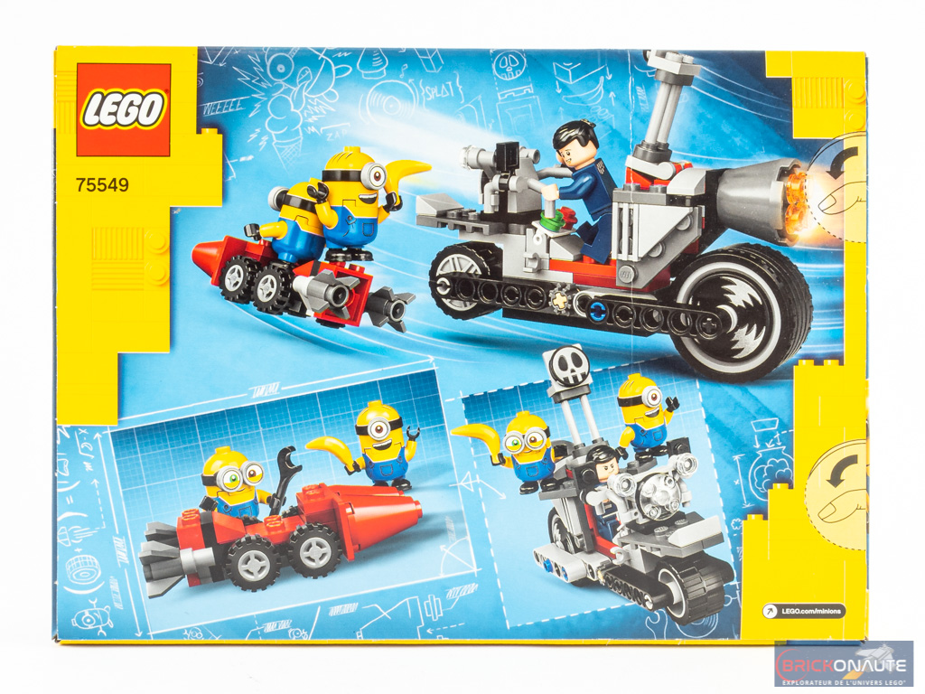 La boîte est colorée, c’est le moins que l’on puisse dire. Sur la face avant, le jeune Gru est aux commandes de son engin, Stuart étant tracté dans un étrange engin rouge tandis que Bob s’apprête à lancer une banane sur ses poursuivants. Dans le coin inférieur droit, Stuart semble s’être fait rouler dessus à en juger par la trace de pneu sur son ventre. Au dos, différents angles nous montrent d’autres détails du modèle.