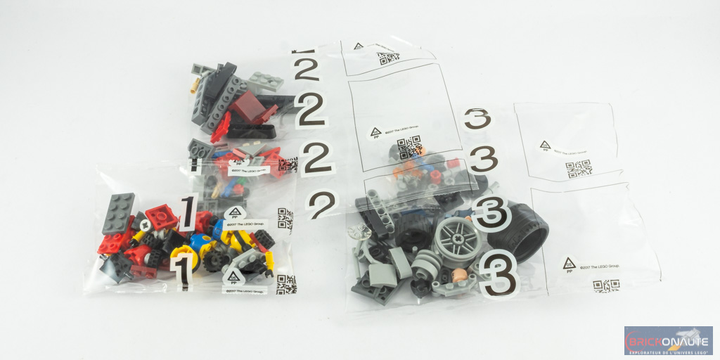 A l’intérieur, nous trouvons 3 sachets de pièces numérotés qui contiennent les 136 pièces de l’inventaire. Autant dire que la construction va être vite réglée. Nous avons également une notice d’instructions de 60 pages pour 56 étapes de construction, et une planche de 3 autocollants. Hormis les éléments qui composent les minifigs, on ne trouve pas d’éléments spécifiques ou rares dans cette boîte.