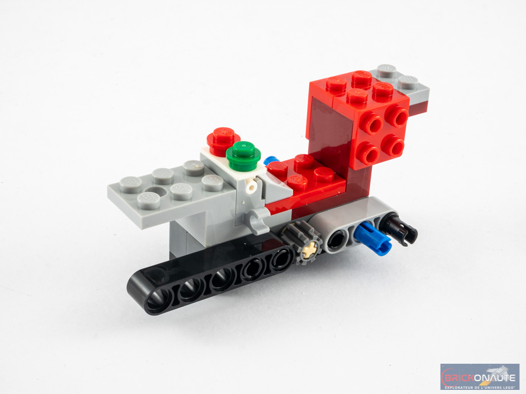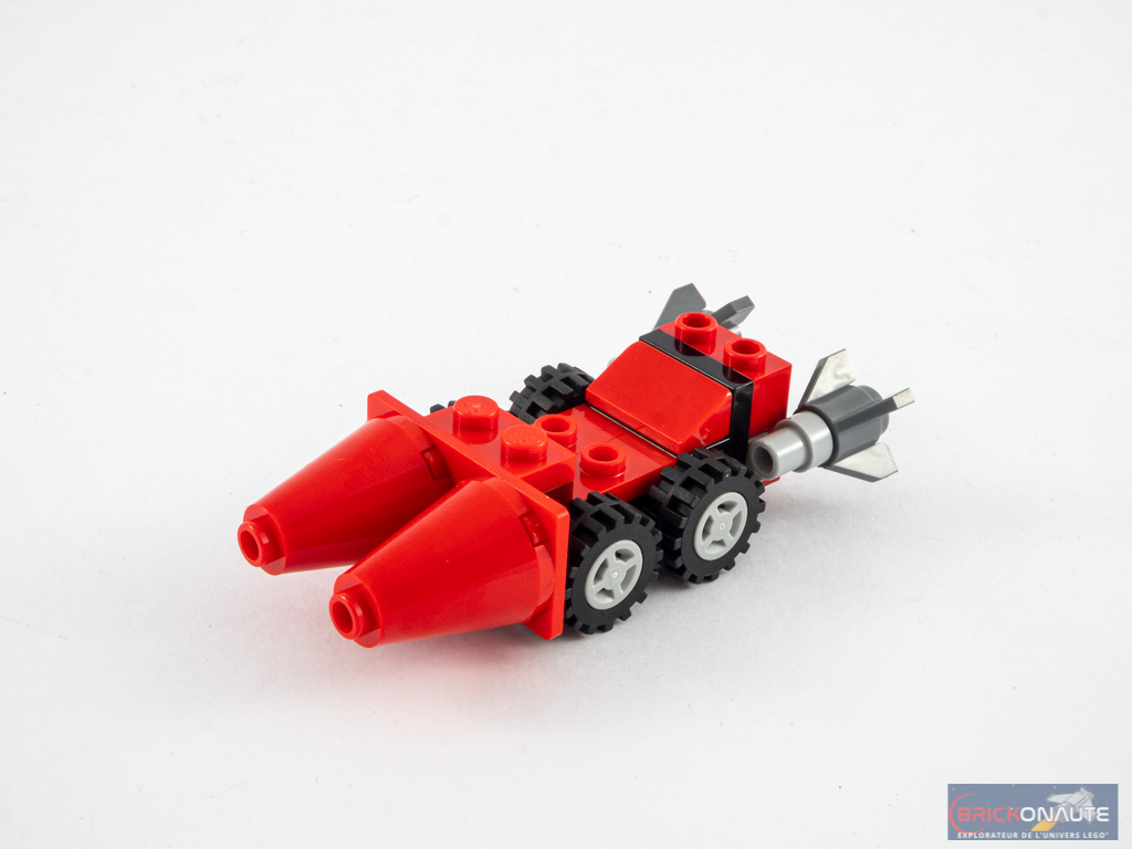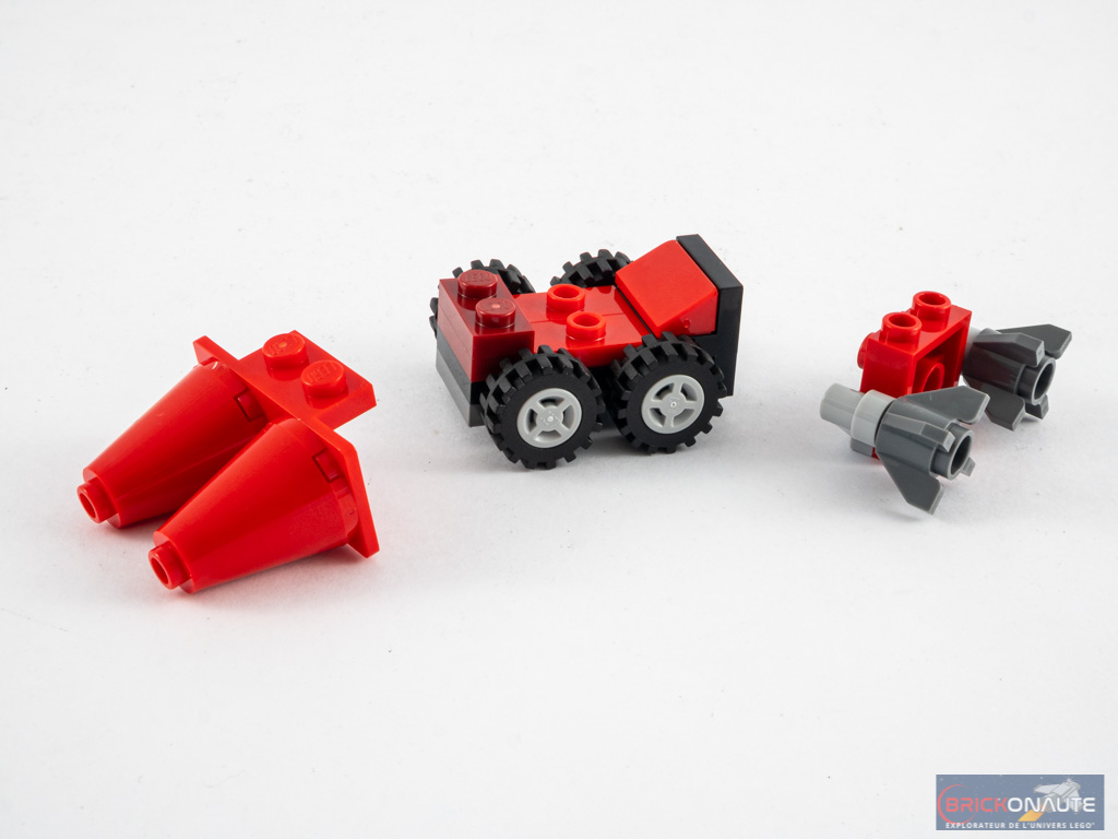 La construction ne prend guère plus de 20 minutes : les 136 pièces de l’inventaire sont en effet réparties dans 3 sachets de pièces numérotés. Avec le premier, nous assemblons les deux Minions et le chariot rouge tiré par la moto. Sa conception est très simple : 4 roues, et quelques pièces SNOT pour fixer les cônes à l’avant et les réacteurs à l’arrière.