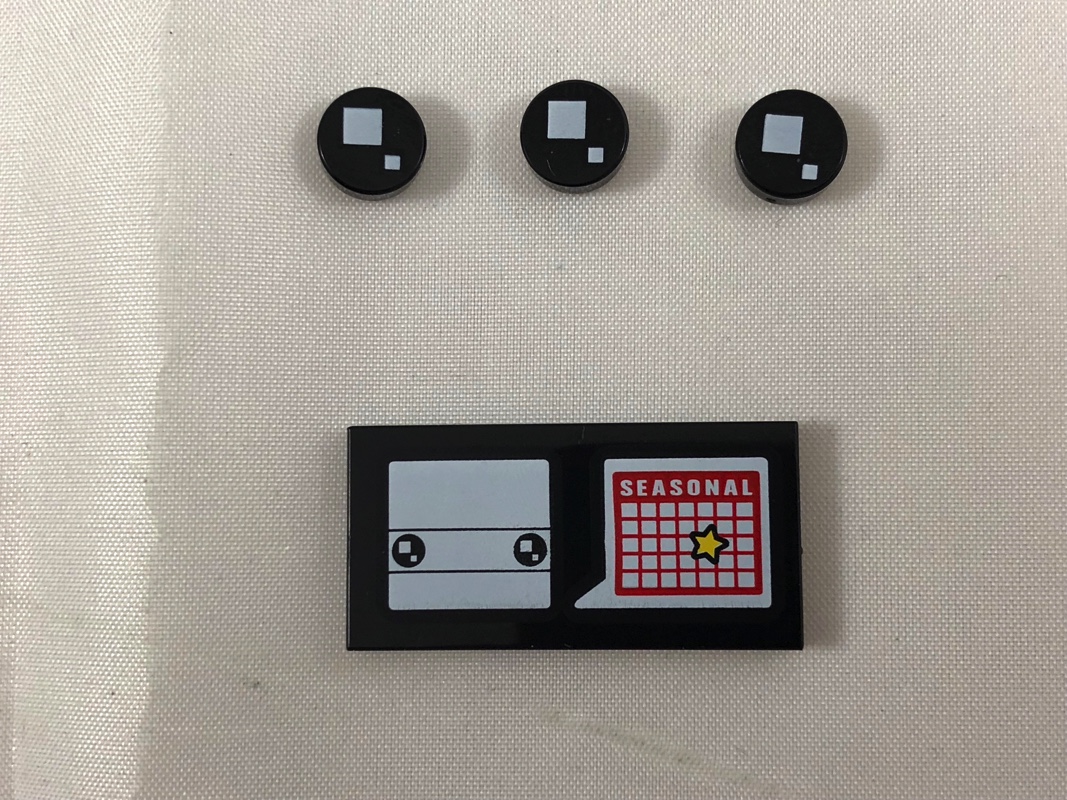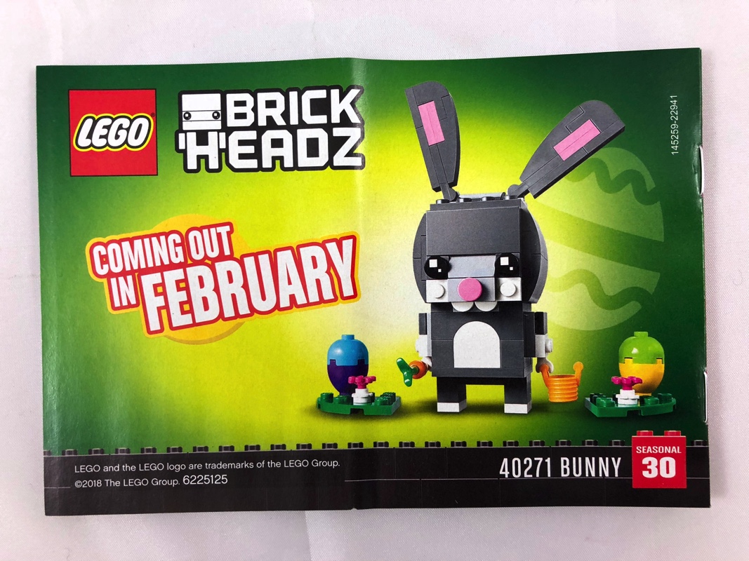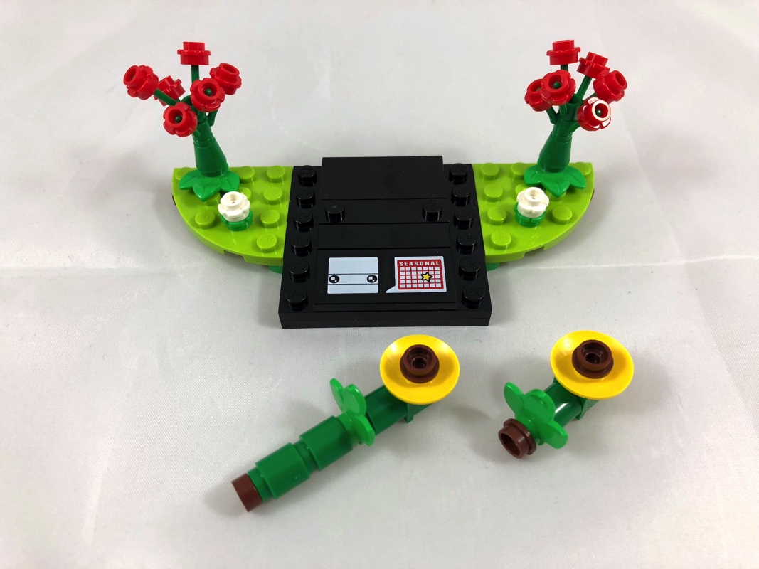 A l’intérieur, deux sachets non numérotés contiennent les 140 pièces. On trouve également la notice d’instructions, au dos de laquelle nous est présenté le prochain set saisonnier à venir : le lapin de Pâques (40271 – Seasonal Easter Bunny). Il est annoncé pour le mois de février et est déjà disponible aux USA. Parmi les pièces tampographiées, pas grand-chose à se mettre sous la dent : 3 yeux, et la tile signalétique représentant cette fois sur sa partie droite un calendrier avec la mention « Seasonal ». Par contre, quelques pièces notables à l’intérieur, comme les nouvelles fleurs (à 5 pétales, livrées en 3 couleurs), les nouvelles tiges, et les nouvelles feuilles sorties à l’occasion de cette année 2018.