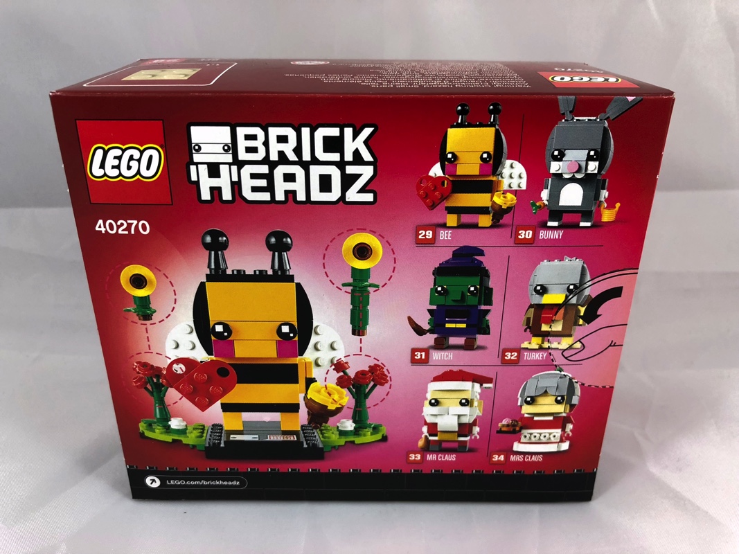 On change ici du format de boîte traditionnellement trouvé dans la gamme BrickHeadz, pour s’orienter vers celui qu’on a l’habitude de trouver pour les sets saisonniers. Néanmoins, la présentation de cette dernière ressemble fortement à celles de la gamme BrickHeadz, avec sur l’avant notre abeille vue de face, sur fond rose (Saint-Valentin oblige), avec dans la partie inférieure droite son nom (Bee), son numéro (28) et sa « sous-série » (Seasonal) dans la gamme. Sur l’arrière, on la retrouve aux côtés des 5 autres modèles qui seront proposés au fil de l’année.
