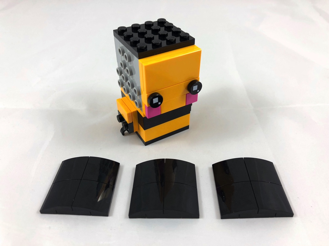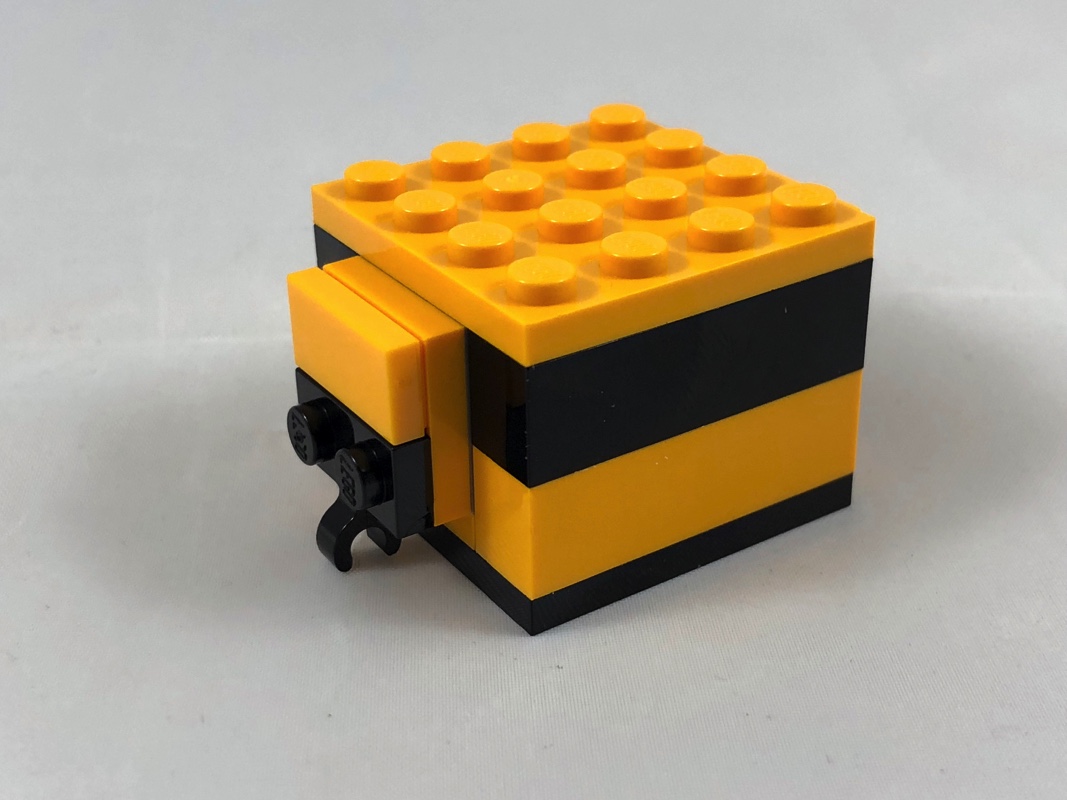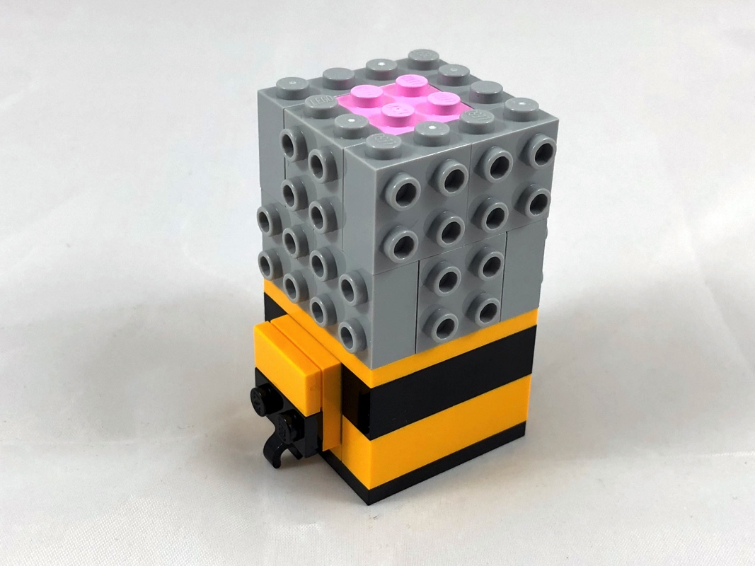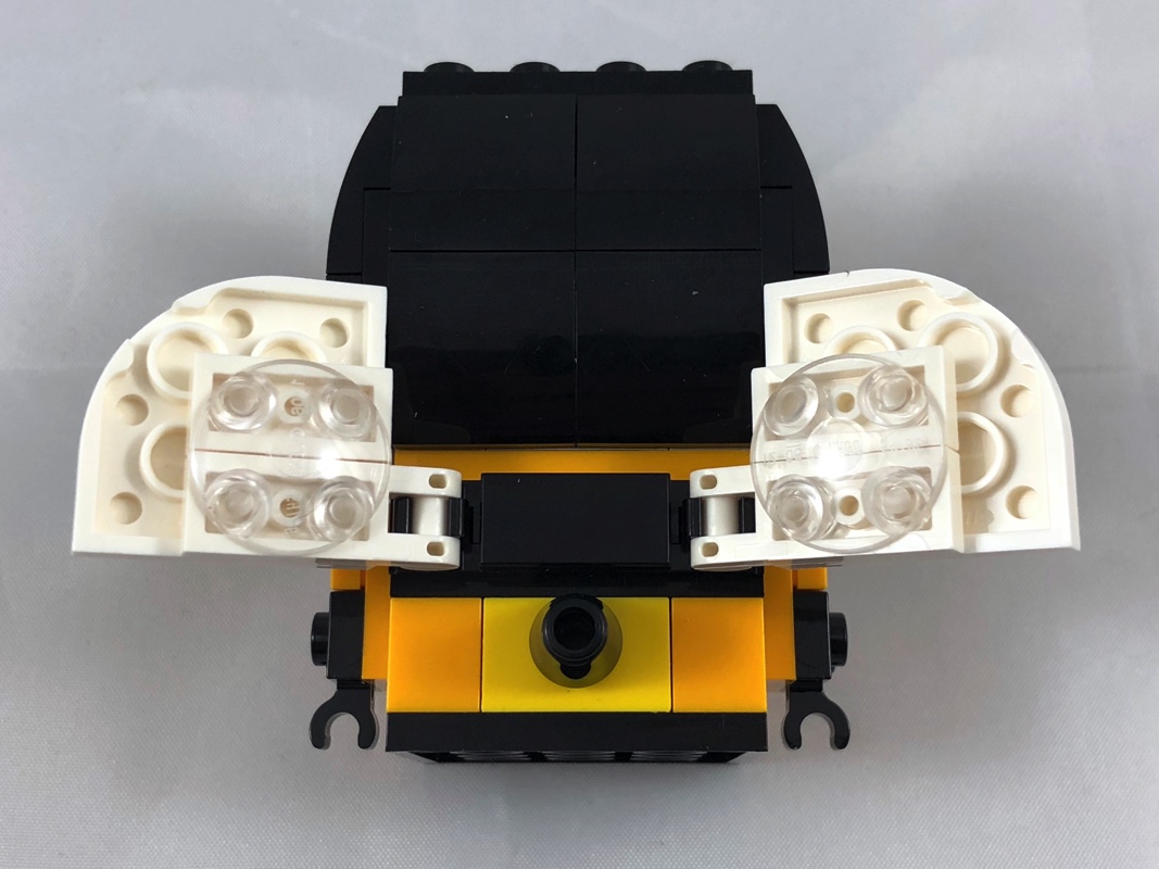 Ces 5 faces terminées, on passe à l’arrière du modèle. On lui ajoute ses deux ailes fixées sur des clips, et son dard sur un pin Technic fixé dans la fameuse brique jaune.