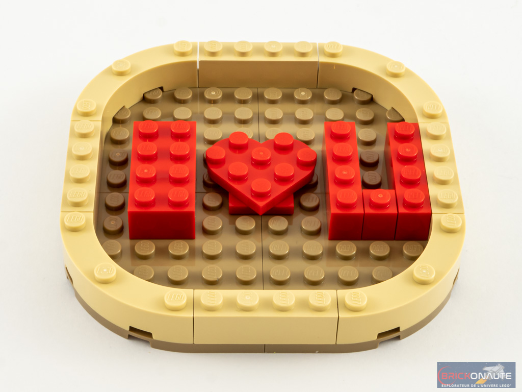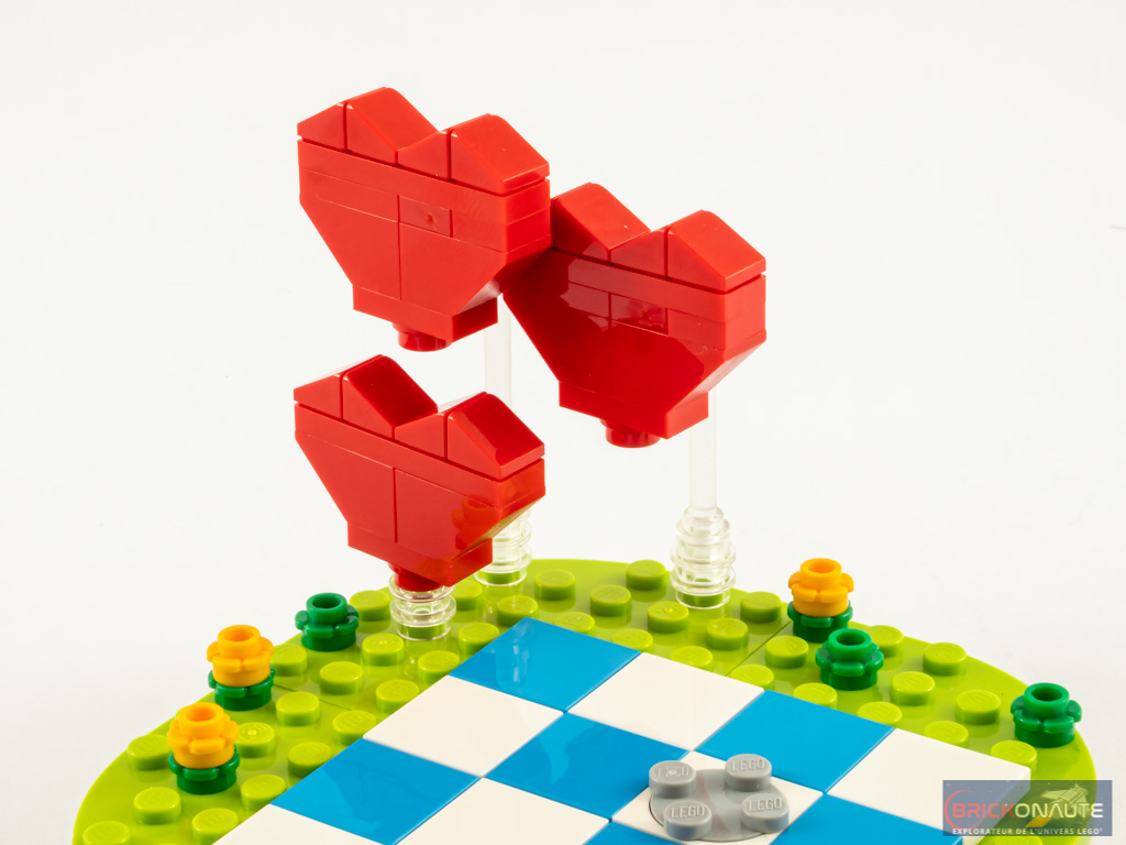 La construction commence par le socle, qui recèle une petite surprise : en guise de remplissage, le designer a écrit le message « I ❤ U ». Une fois le socle refermé, ce message reste un secret pour qui n’a pas construit le modèle. On ajoute un carrelage, une turntable et quelques fleurs sur le socle, puis on construit 3 coeurs que l’on fixe sur des tiges transparentes.