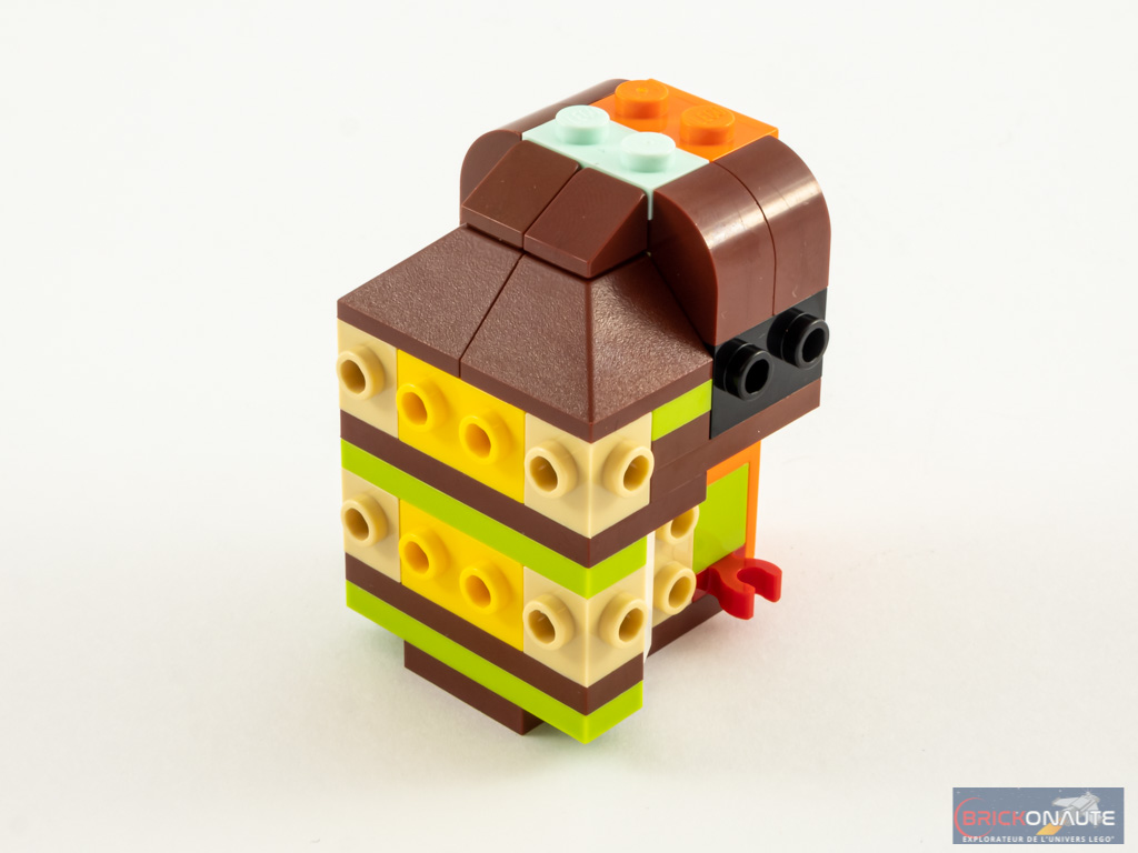 La construction de la tête rappellera des souvenirs à ceux qui aiment la gamme LEGO BrickHeadz : on construit une base SNOT, que l’on décore ensuite sur ses différentes faces. Les oreilles rondes sont clipsées et sont donc légèrement orientables. Il ne reste qu’à fixer l’ours sur son support et l’affaire est faite. A la fin de la notice d’instructions, LEGO nous propose un visuel de l’animal suivant : un lapin de Pâques qui porte la référence 40463.