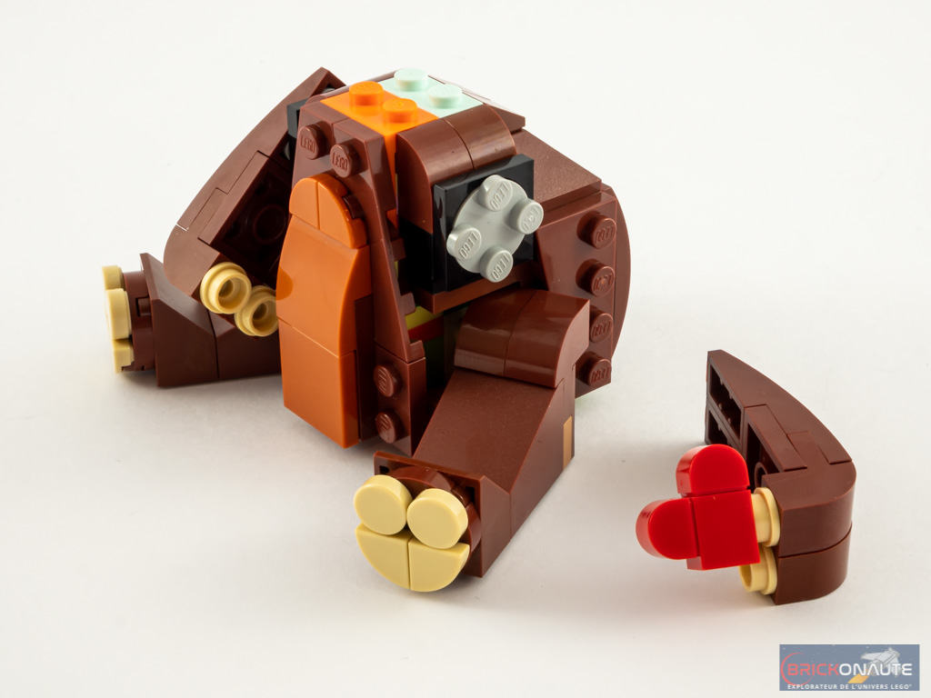 C’en est fini du socle, on passe ensuite au plat de résistance : l’ours. Et j’ai été très agréablement surpris par la construction de celui-ci. A l’intérieur du corps, un jeu de brackets et autres briques SNOT permet la fixation des pièces de la fourrure. Les pattes arrières sont fixées sur des clips, tandis que les pattes avant sont attachées sur des turntables. L’arrière de la boîte nous précise que ces pattes avant sont mobiles. C’est vrai, mais cette conception ne permet pas de les placer dans la position qu’on souhaite : elles retombent sous leur propre poids. Petite note au passage : le petit coeur tenu par l’ours est, comme prévu, différent dans les instructions par rapport au visuel de la boîte 😁.