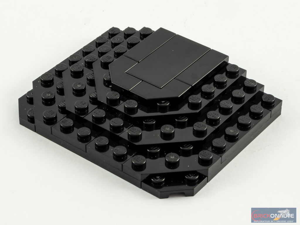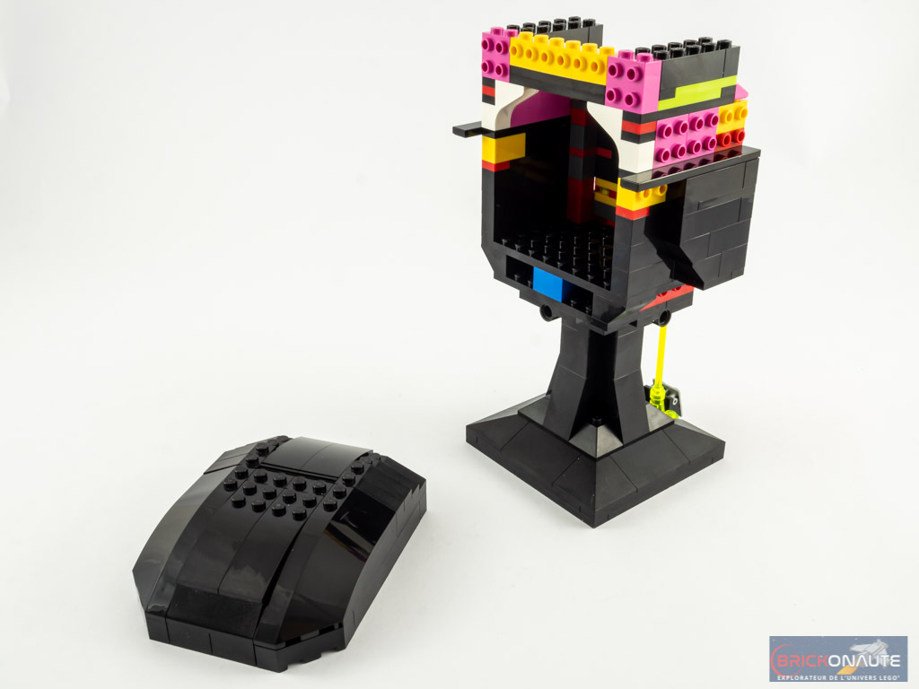 On ajoute des clips pour la fixation du front, puis on complète les côtés et l’arrière avec quelques briques SNOT. On construit alors un grand sous-ensemble noir dont les courbes sont obtenues avec de grandes slopes habituellement utilisées dans les carrosseries, que l’on fixe à l’arrière du crâne. Un second sous-ensemble prend place sur le haut de la tête.