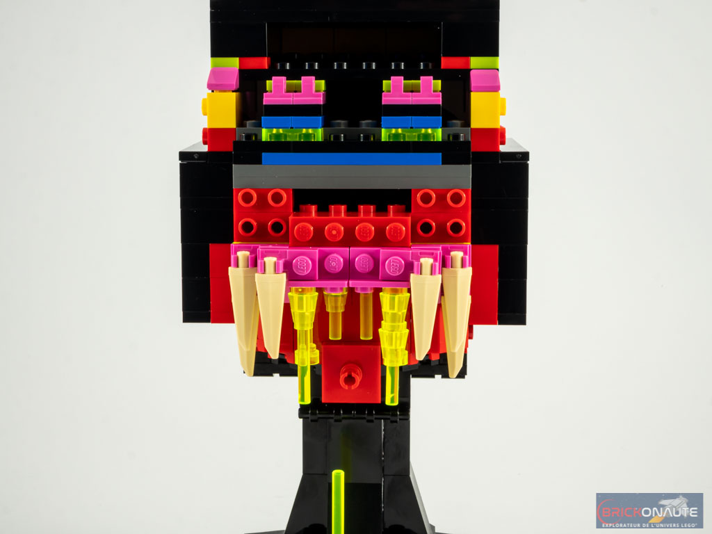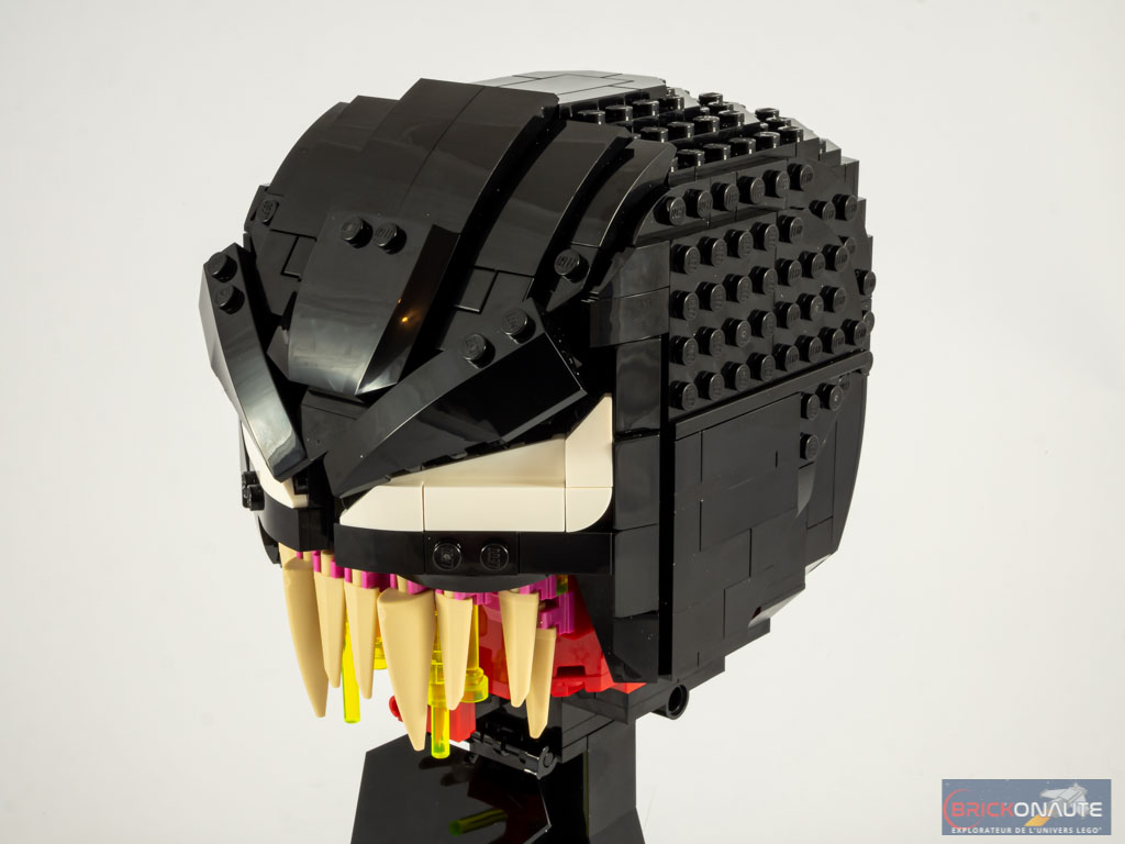 La construction est pour ainsi dire identique à celle du set 76199 Carnage. Hormis la différence de couleur, on notera deux petites « fantaisies » supplémentaires : une langue, fixée sur un pin à l’intérieur de la bouche, et une bave jaune translucide coulant à l’intérieur de la bouche. Autre différence nettement plus intéressante : il n’y aura dans ce set aucun autocollant à appliquer.
