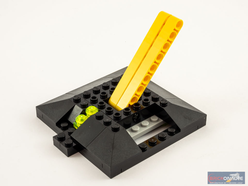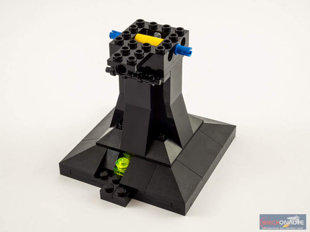 La construction commence ainsi par le socle d’exposition. Deux beams Technic, fixés sur un axe à la base, et sur des pins en partie haute, permettent d’en assurer la rigidité. On assemble ensuite la structure de la face, essentiellement constituée d’éléments SNOT, et les deux côtés un peu trop lisses et plats. Ceux-ci consistent simplement en un empilement basique de briques. Remarquez ici la tige jaune translucide représentant la bave qui vient couler jusque sur le socle.