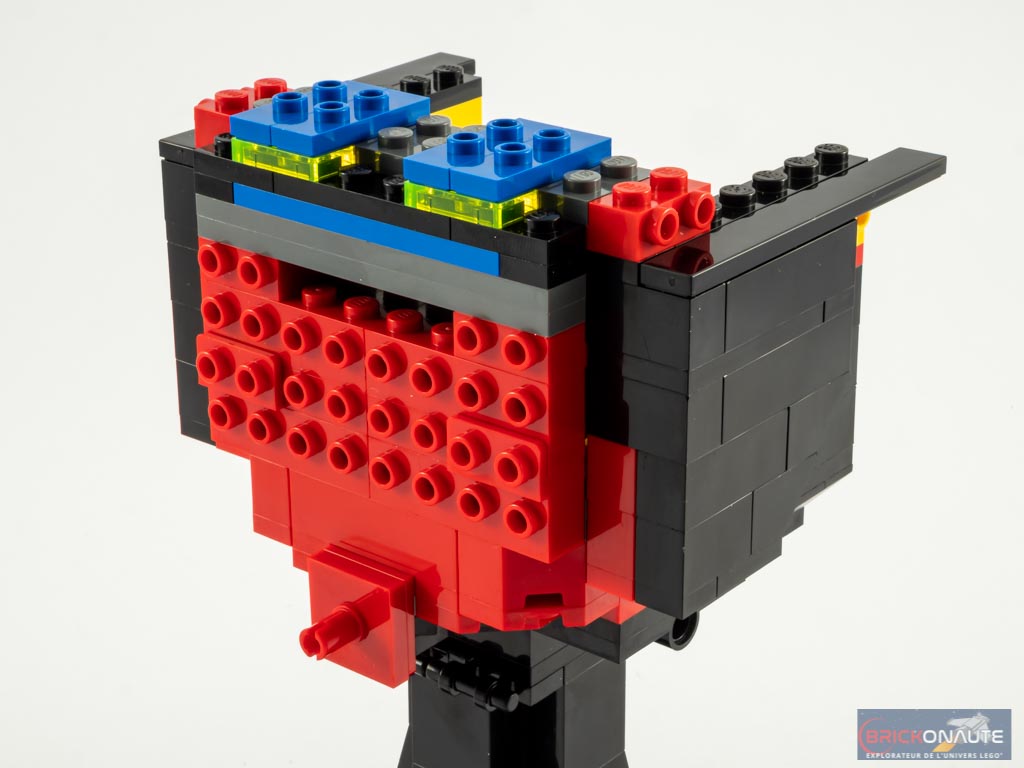 On termine la construction en attachant la langue sur un pin situé à l’intérieur de la bouche, et la plate tampographiée avec la gamme et le nom du personnage.