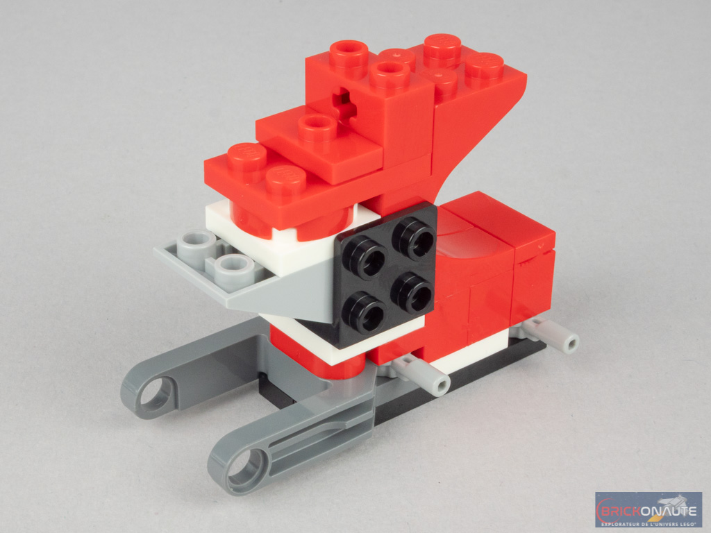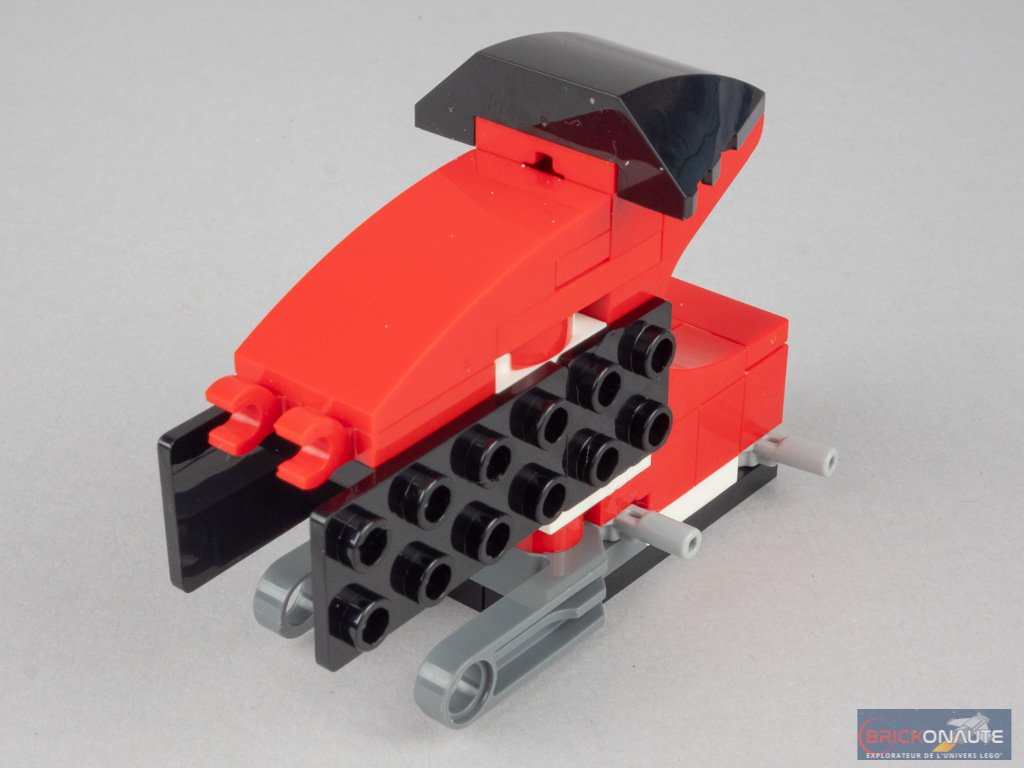 Pour un set ne contenant « que » 118 pièces, la construction est plutôt intéressante et fait de ce petit scooter un digne représentant de la gamme LEGO Creator. On commence par un châssis comportant une fourche côté arrière, et des éléments SNOT sur les côtés. Des pièces courbées viennent donner au scooter sa forme définitive à l’arrière. C’est un petit sous-ensemble clipsé qui comporte le feu arrière et la plaque d’immatriculation. La fourche est assemblée à part, avant d’être fixée à la structure par un axe Technic. Les derniers élément ajoutés sont les marchepieds, dont l’angle est savamment trouvé grâce à deux clips.