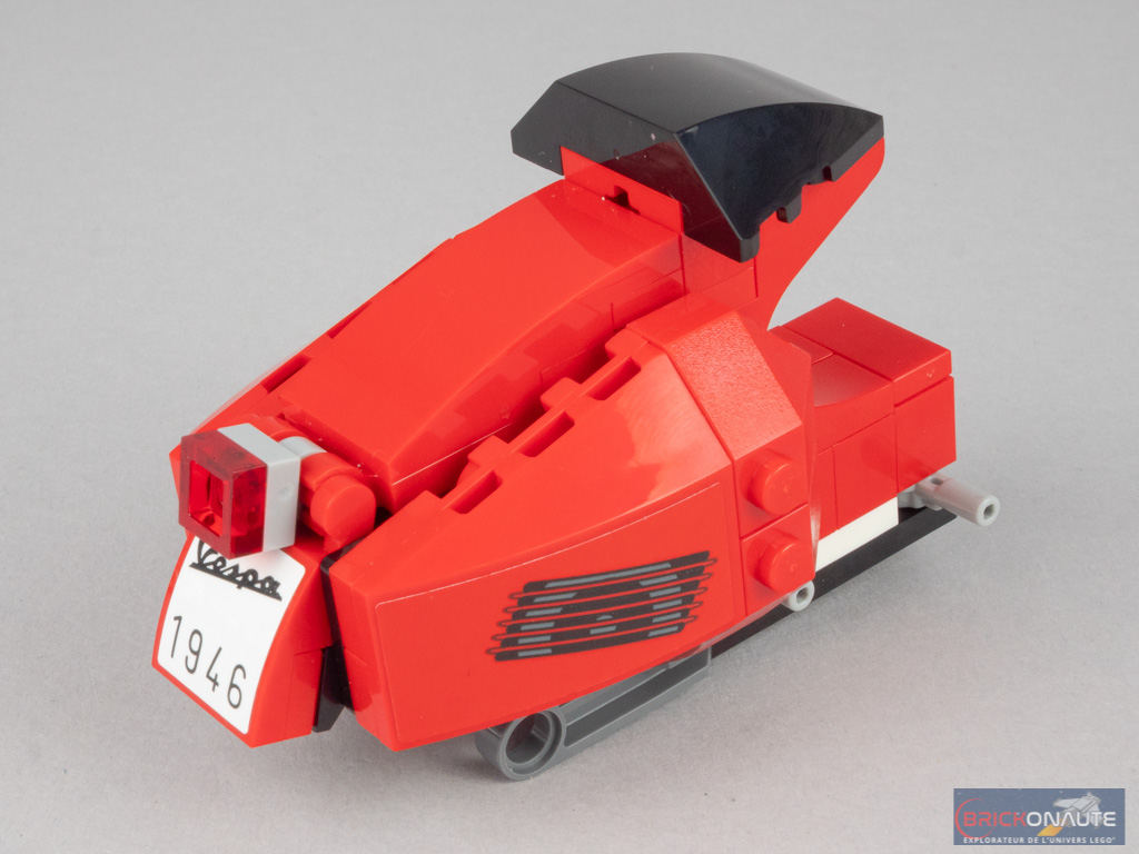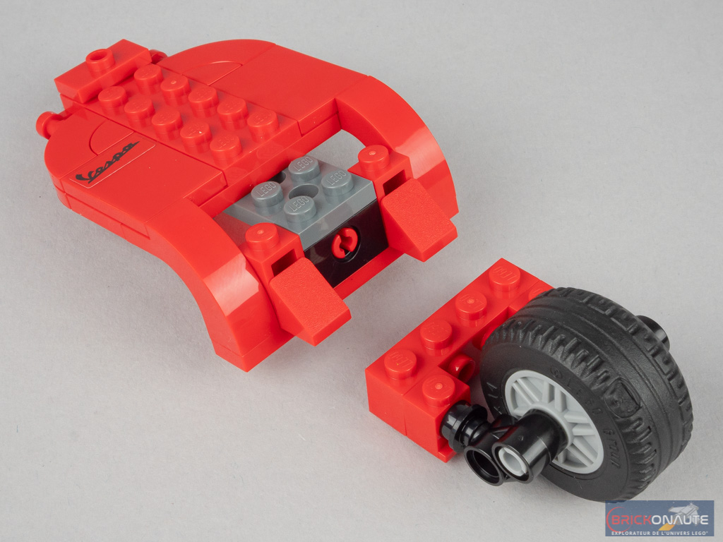Concernant le design de l’engin, et compte-tenu de la taille contrainte de celui-ci, je trouve que le designer s’en tire très honorablement. L’engin est reconnaissable au premier coup d’oeil, et cette couleur rouge « flashy » me semble être un bon choix. Il y a un point sur lequel je le trouve même mieux que son grand frère 10298 Vespa 125 : les demi-coques arrières sont plus plongeantes, et donc plus fidèles à l’engin de référence. Remarquez également les deux roues qui viennent « s’insérer » dans l’engin – la conception est franchement bien pensée. Petite précision importante : la fourche est fixe
