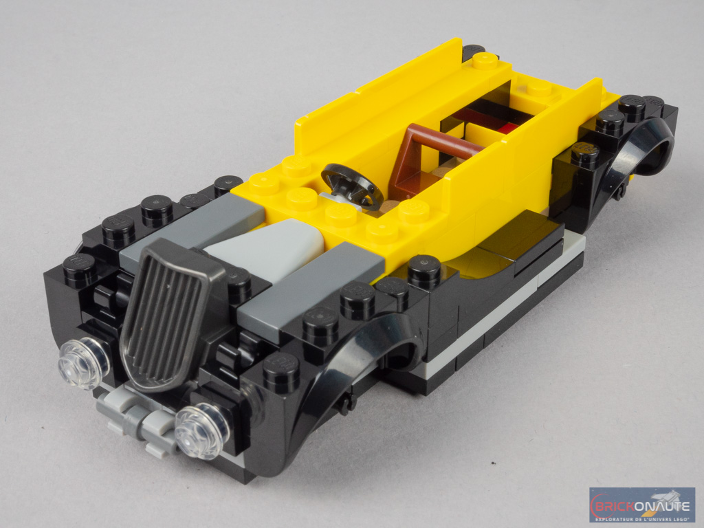 Le design général est franchement réussi, les différentes courbes s’alignant parfaitement les unes avec les autres, et le choix de couleurs donnant à ce taxi un véritable aspect « vintage » – librement inspiré de la Citroën Traction Avant des années 1930. Je suis malgré tout moyennement fan de la réutilisation de la même pièce pour la réalisation du pare-brise et de la lunette arrière. On appréciera l’absence totale de stickers : contrairement à beaucoup de voitures LEGO, toutes les optiques sont brick-built.