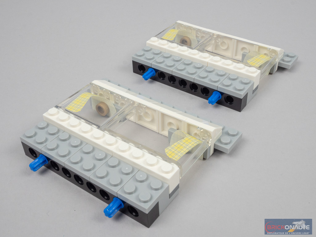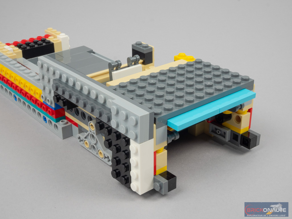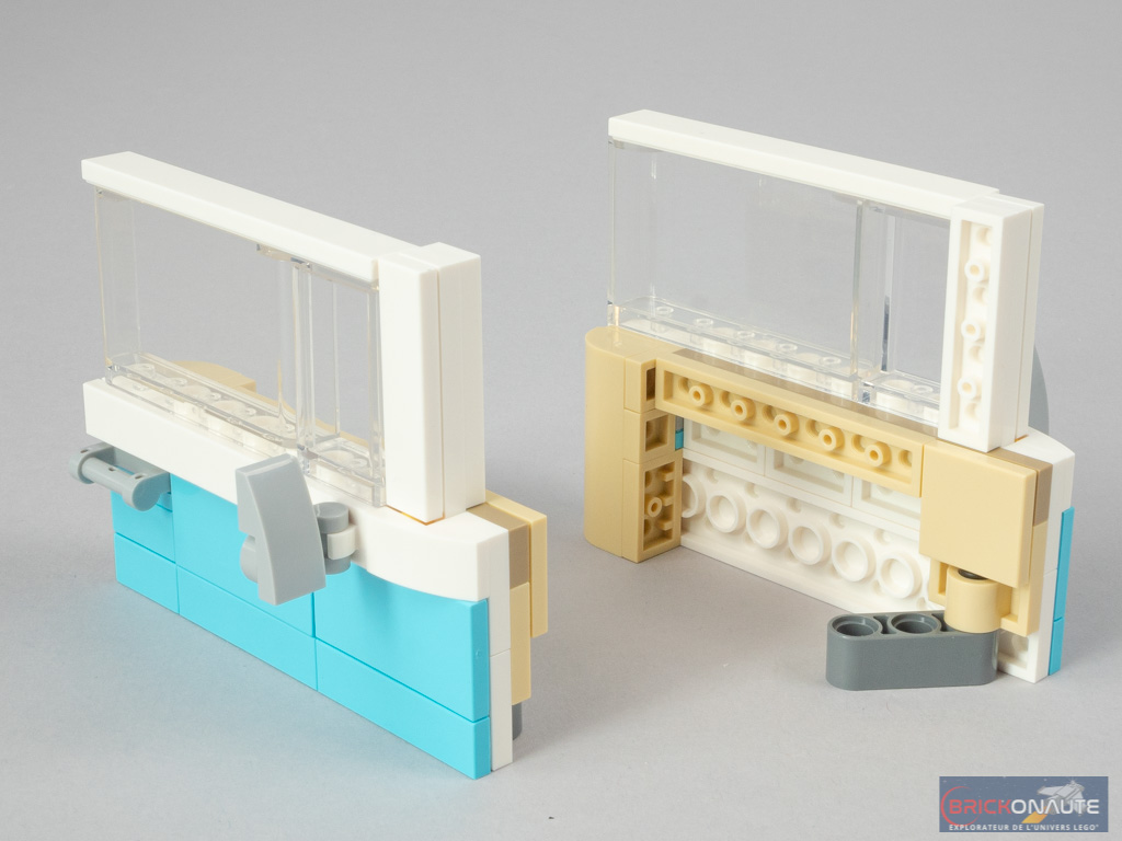 On repart sur des éléments Technic ensuite, pour constituer la structure externe du van. Ici, ce sont deux sous-ensembles en forme de L qui retiendront le toit de la cabine. Côté arrière, on observe deux structures différentes et pour cause. D’un côté, des éléments Technic retiendront les fenêtres. De l’autre, un mécanisme ingénieux permettra d’ouvrir la porte coulissante en poussant sur un axe dépassant légèrement sous le véhicule. On termine cette étape en ajoutant les premiers morceaux de carrosserie et les feux arrières.