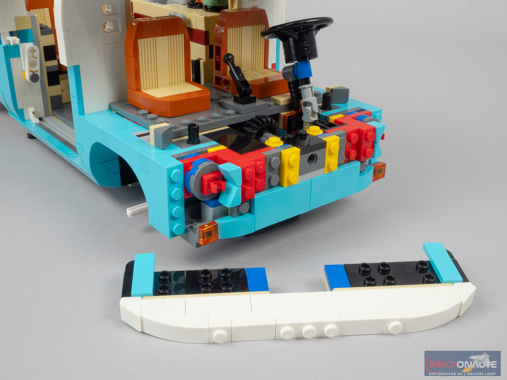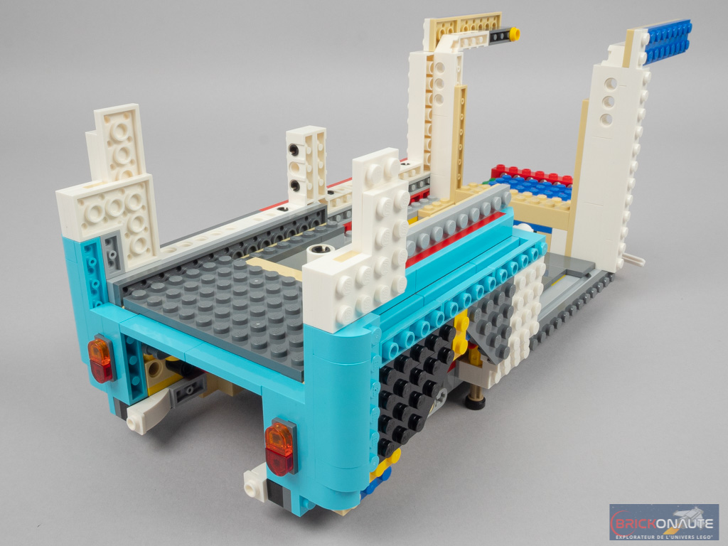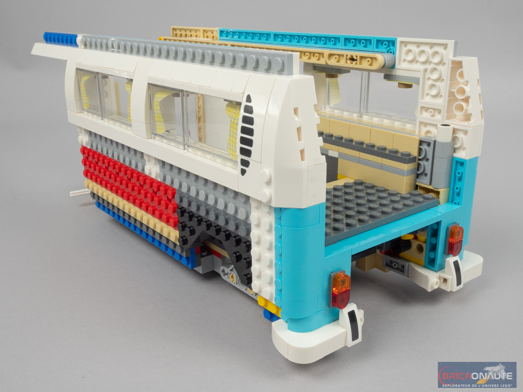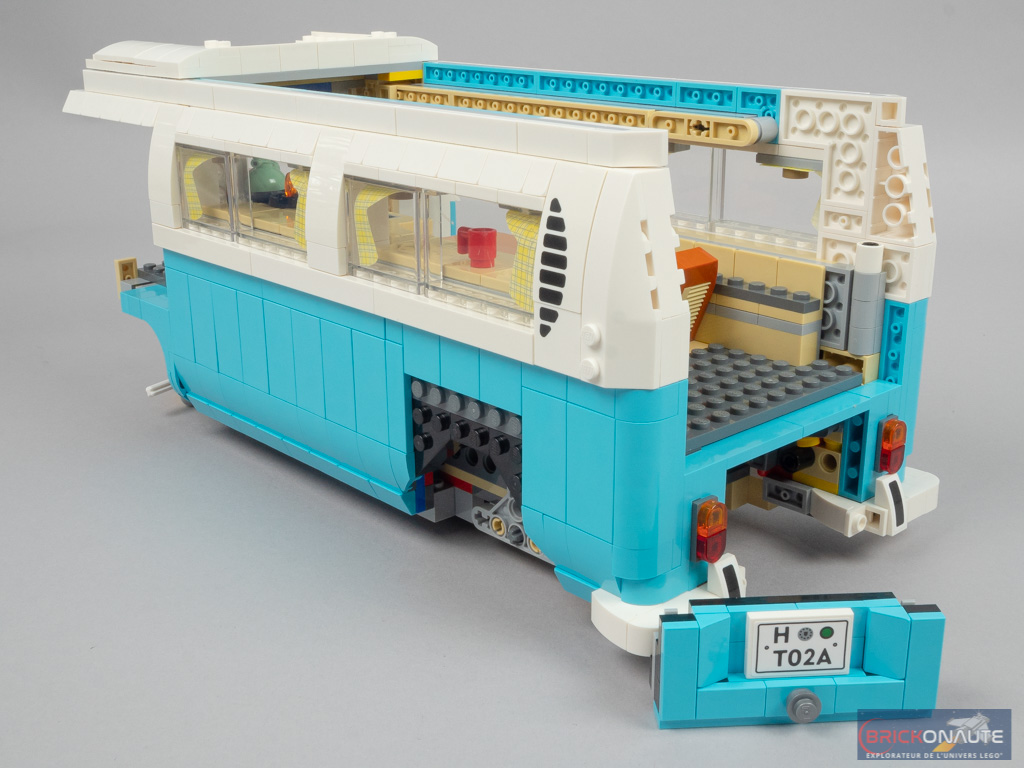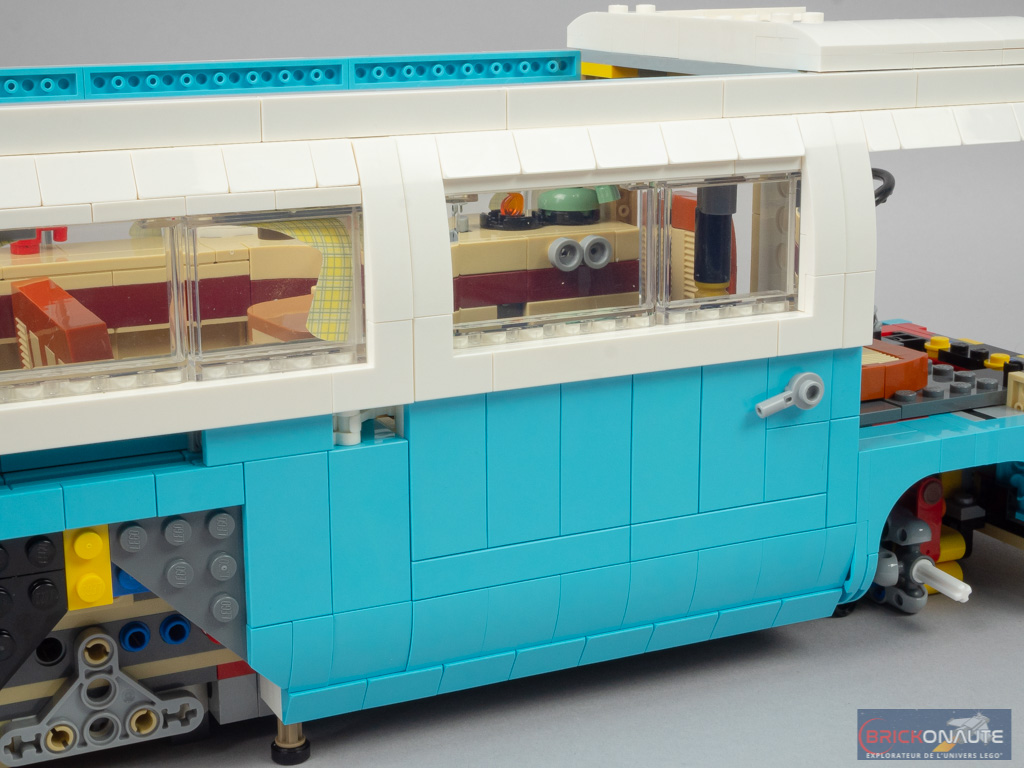 LEGO a peut-être voulu en faire un peu trop en termes de fonctionnalités, et c’est donc le design qui en pâtit partiellement. Mais il faut bien avouer que ces différentes fonctionnalités sont toutes plus intéressantes les unes que les autres. Outre la direction fonctionnelle, on en remarquera surtout deux autres : le mécanisme d’ouverture de la porte latérale, en poussant sur un petit axe Technic situé sous le combi. Et celui de déploiement du toit, maintenu en place par un amortisseur. Concernant le toit, celui-ci est facilement détachable pour accéder à l’intérieur du véhicule. Et la direction est reportée sous la roue de secours, astucieux !