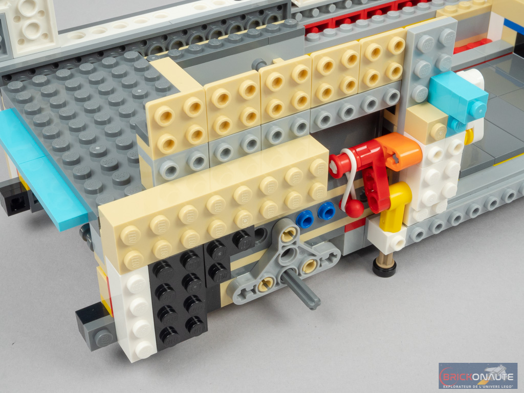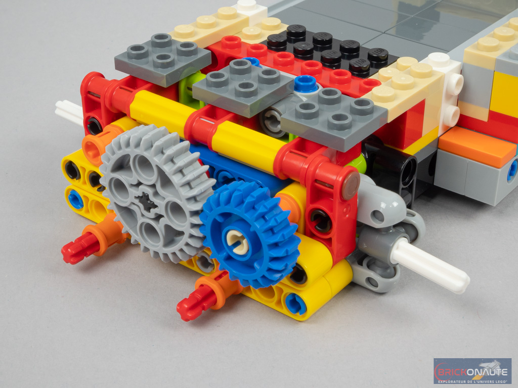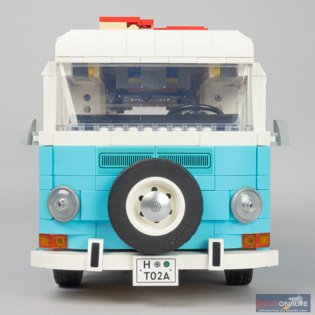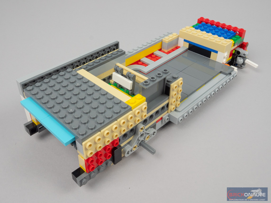 LEGO a peut-être voulu en faire un peu trop en termes de fonctionnalités, et c’est donc le design qui en pâtit partiellement. Mais il faut bien avouer que ces différentes fonctionnalités sont toutes plus intéressantes les unes que les autres. Outre la direction fonctionnelle, on en remarquera surtout deux autres : le mécanisme d’ouverture de la porte latérale, en poussant sur un petit axe Technic situé sous le combi. Et celui de déploiement du toit, maintenu en place par un amortisseur. Concernant le toit, celui-ci est facilement détachable pour accéder à l’intérieur du véhicule. Et la direction est reportée sous la roue de secours, astucieux !