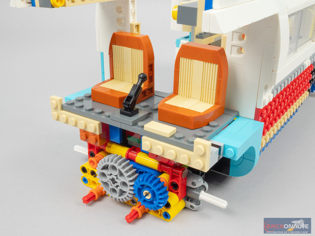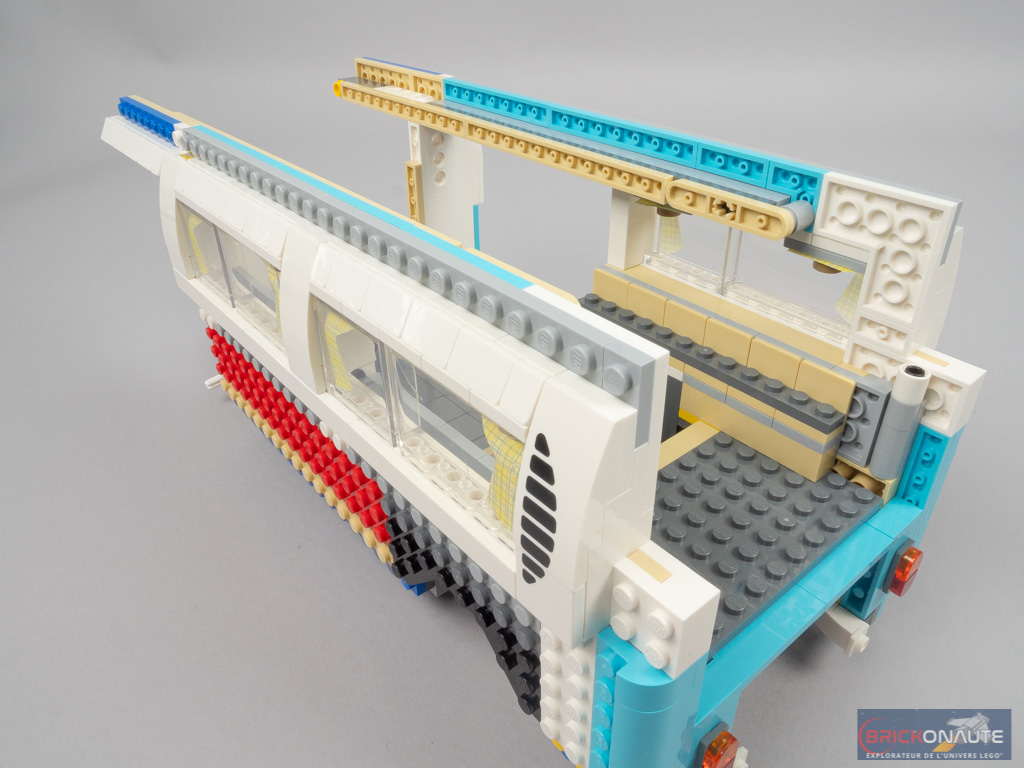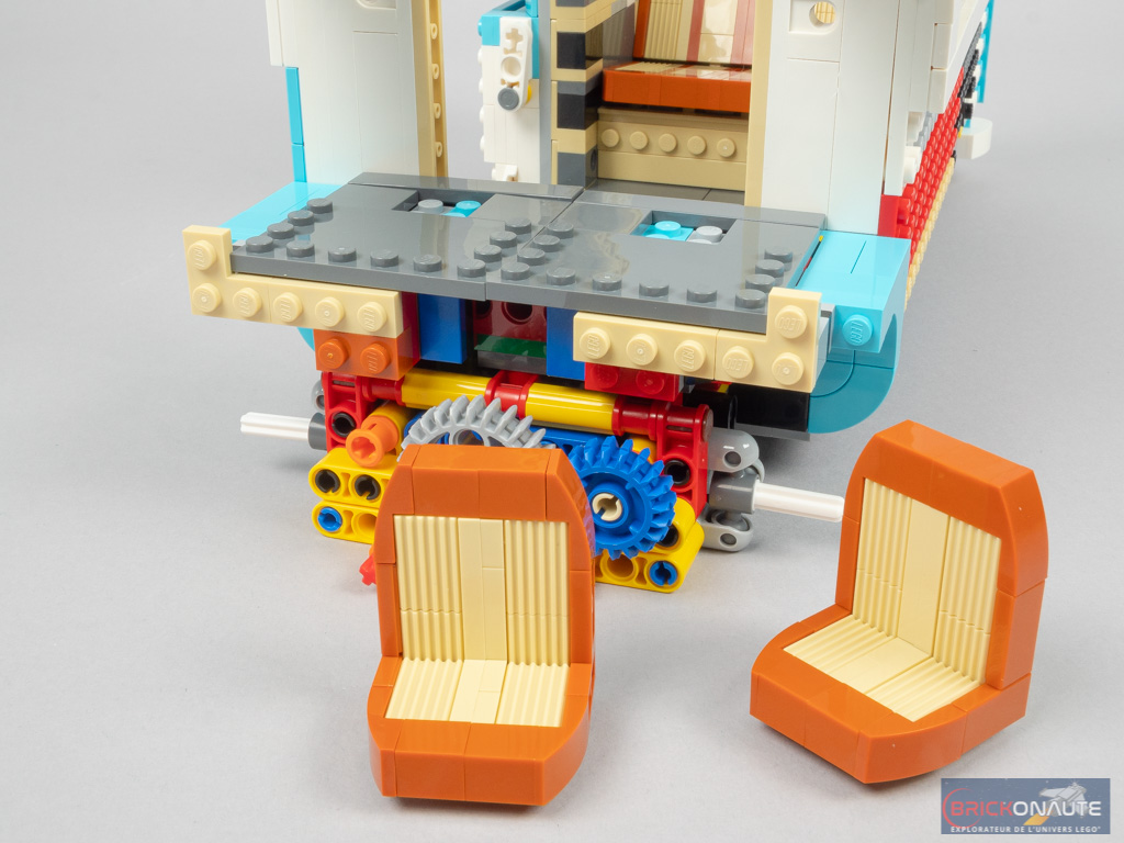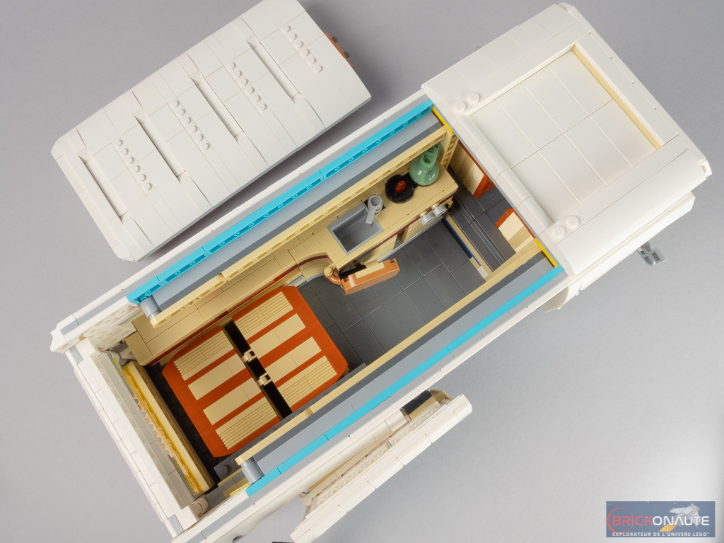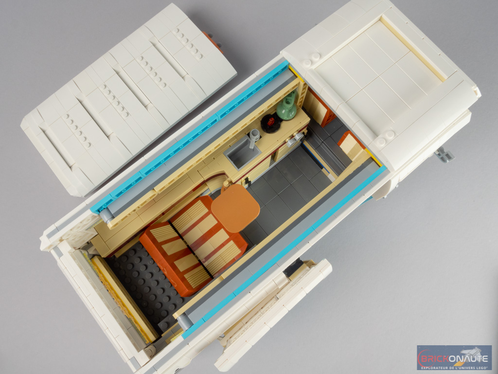 L’intérieur est en demi-teinte. À l’arrière, la réalisation est soignée avec un bel aménagement, de jolis placards qui s’ouvrent et une banquette qui se rabat. Même si cet intérieur peut paraître un peu « terne » lorsqu’on le compare au set 10220. Et moins riche que pour ce dernier – pas d’éclairage ni de douche dans notre modèle, par exemple.