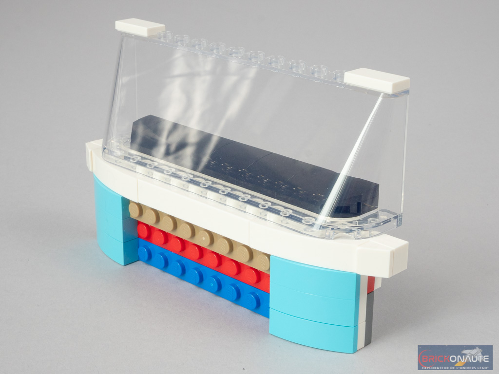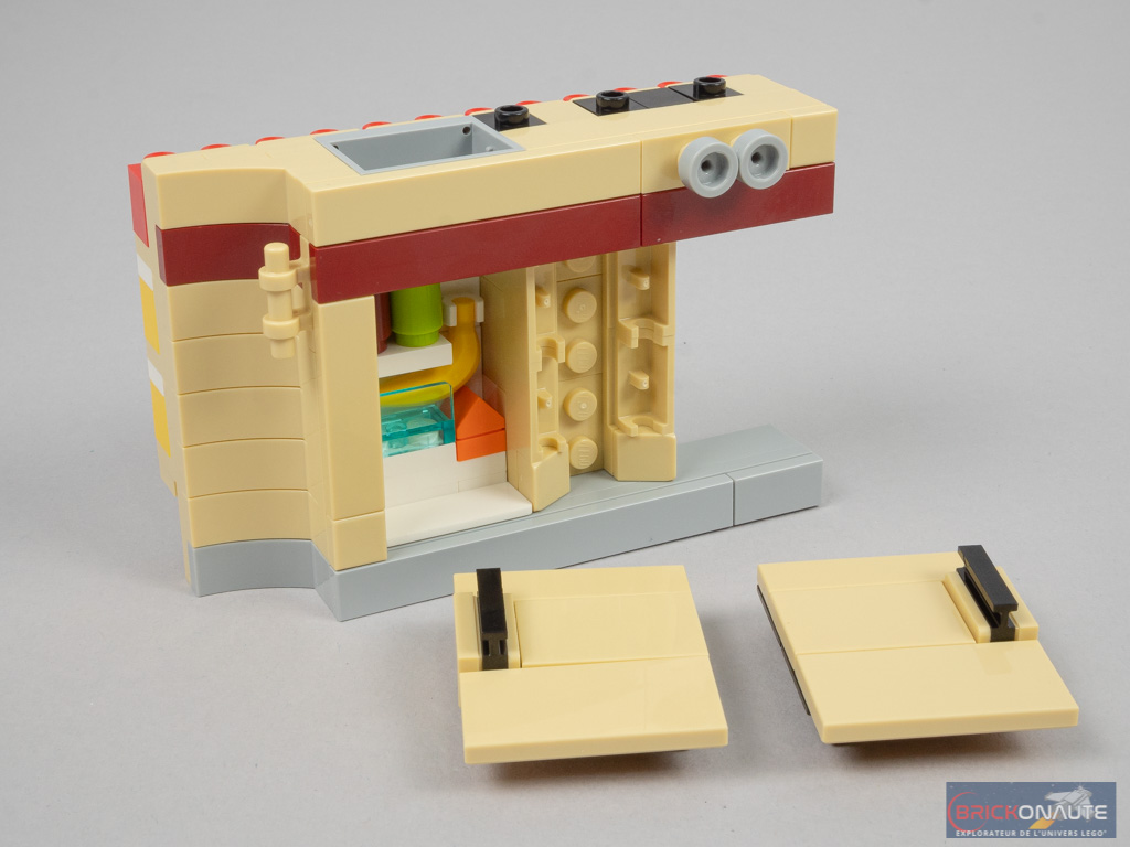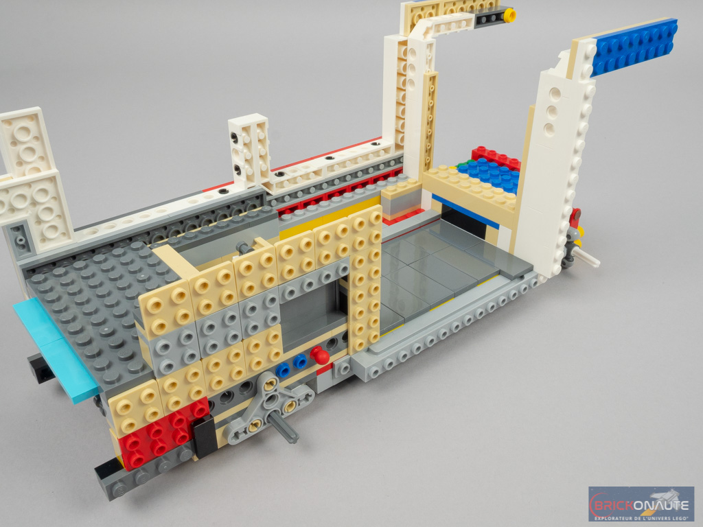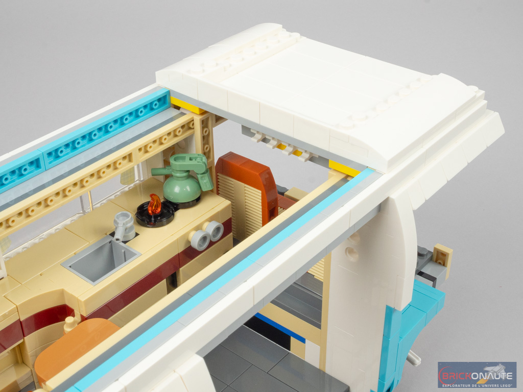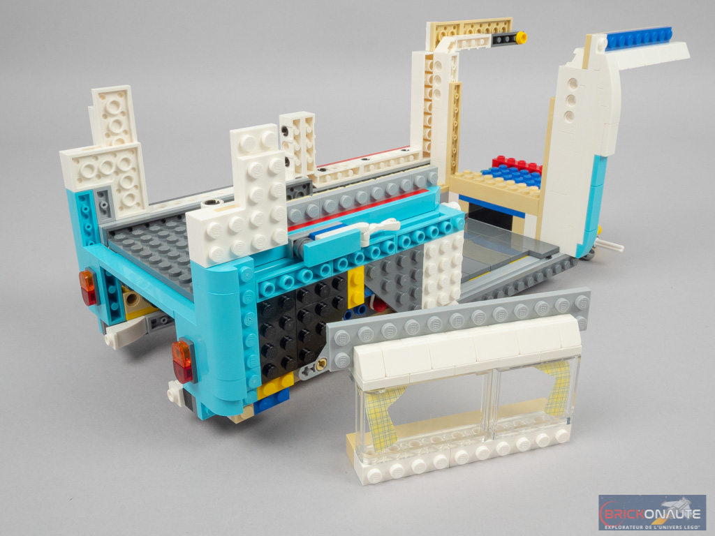 L’intérieur est en demi-teinte. À l’arrière, la réalisation est soignée avec un bel aménagement, de jolis placards qui s’ouvrent et une banquette qui se rabat. Même si cet intérieur peut paraître un peu « terne » lorsqu’on le compare au set 10220. Et moins riche que pour ce dernier – pas d’éclairage ni de douche dans notre modèle, par exemple.