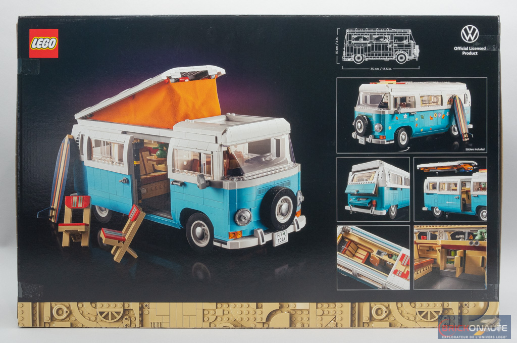 LEGO ne déroge pas à la règle avec ce set dédié à un public adulte, qui reprend la livrée noire habituelle de ses congénères. Sur la face avant, le toit du van est déployé et le surf est posé, debout, sur la porte coulissante. À l’arrière, on le retrouve sous le même angle mais cette fois-ci avec la porte coulissante ouverte et les deux chaises pliantes disposées devant. Plusieurs vignettes nous montrent les principales fonctionnalités du modèle, je reviendrai sur chacune d’entre elles au fil de mon test. On découvre également quelques visuels de l’intérieur aménagé. Sur l’une des vignettes, qui nous montre le van « personnalisé » à l’aide d’autocollants, on trouve la mention stickers included : sympa de prévenir 😅.