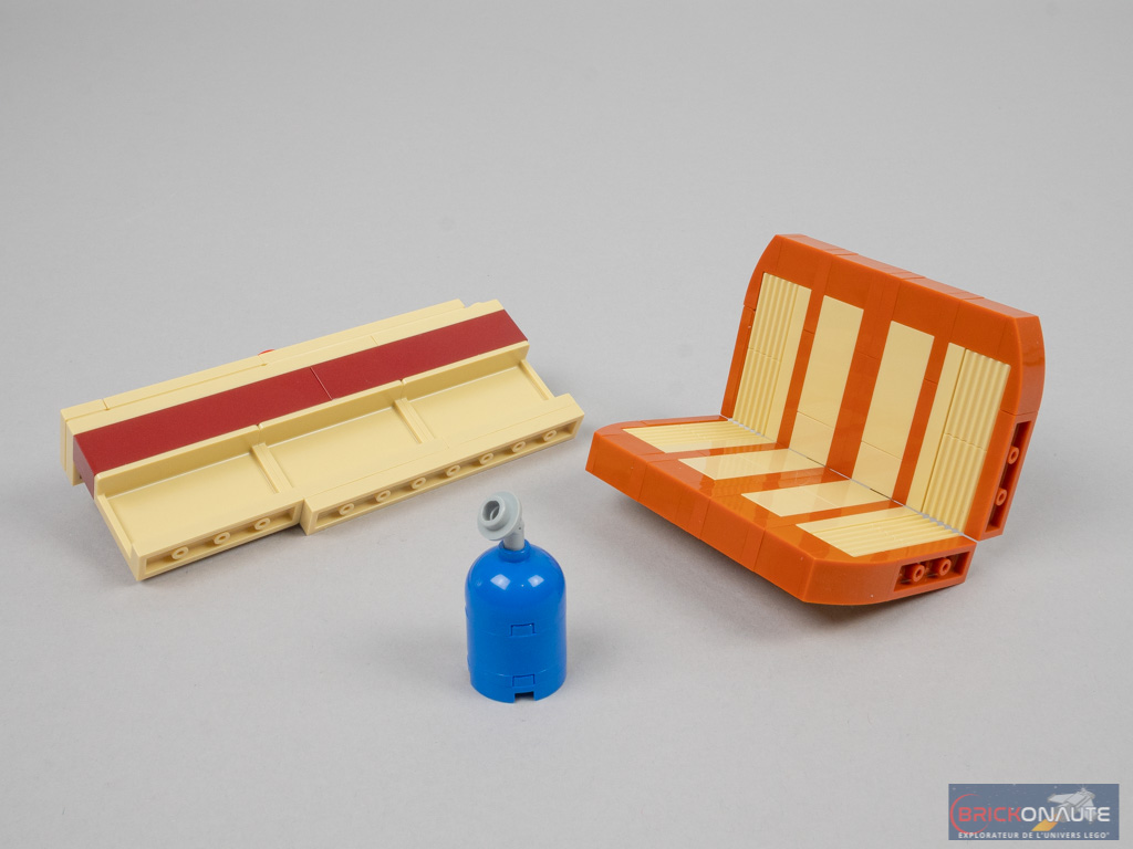 Il est temps de commencer l’aménagement intérieur. On construit trois sous-assemblages : le plan de travail situé à l’arrière, la banquette arrière fixée sur des clips (et rabattable en couchette), et une petite bouteille de gaz. On s’occupe alors de l’avant avec le plancher de la cabine, puis une partie des passages de roues. On assemble alors les deux sièges qu’on pose directement sur ce plancher – c’est d’ailleurs ce qui rend cet intérieur un peu étrange.