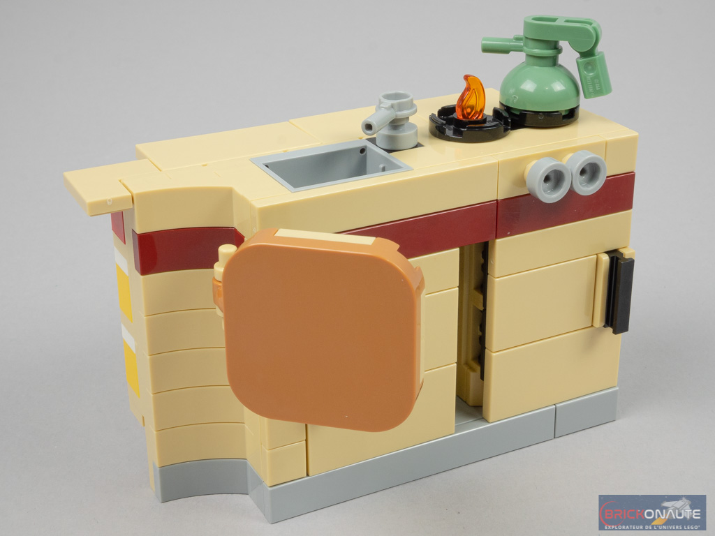 On continue l’aménagement intérieur avec un grand sous-ensemble qui comprend plein de choses : un placard pour la bouteille de gaz, le frigo, l’évier et son robinet, la table rabattable, les plaques de cuisson et la bouilloire. La conception des portes est intéressante, avec une petite poignée noire. On construit alors un grand sous-ensemble qui vient former le toit de la cabine.