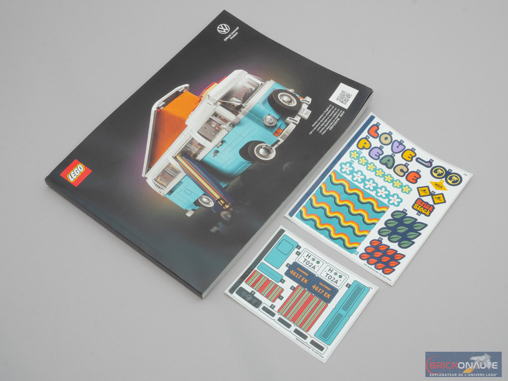On trouve enfin deux planches d’autocollants. La première en compte 17, et sera utilisée pour le design « principal » du set, au fil des étapes de construction. Sur la deuxième planche, on en trouve 65 qui serviront, si vous le souhaitez, à personnaliser le van selon vos souhaits.